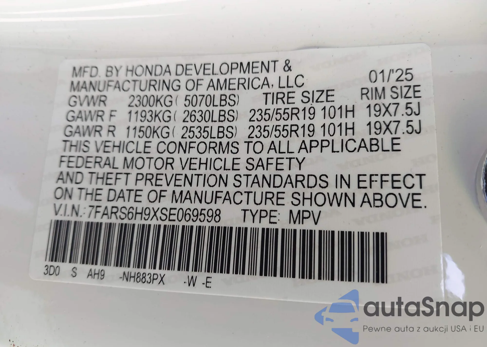 VIN: 7FARS6H9XSE069598