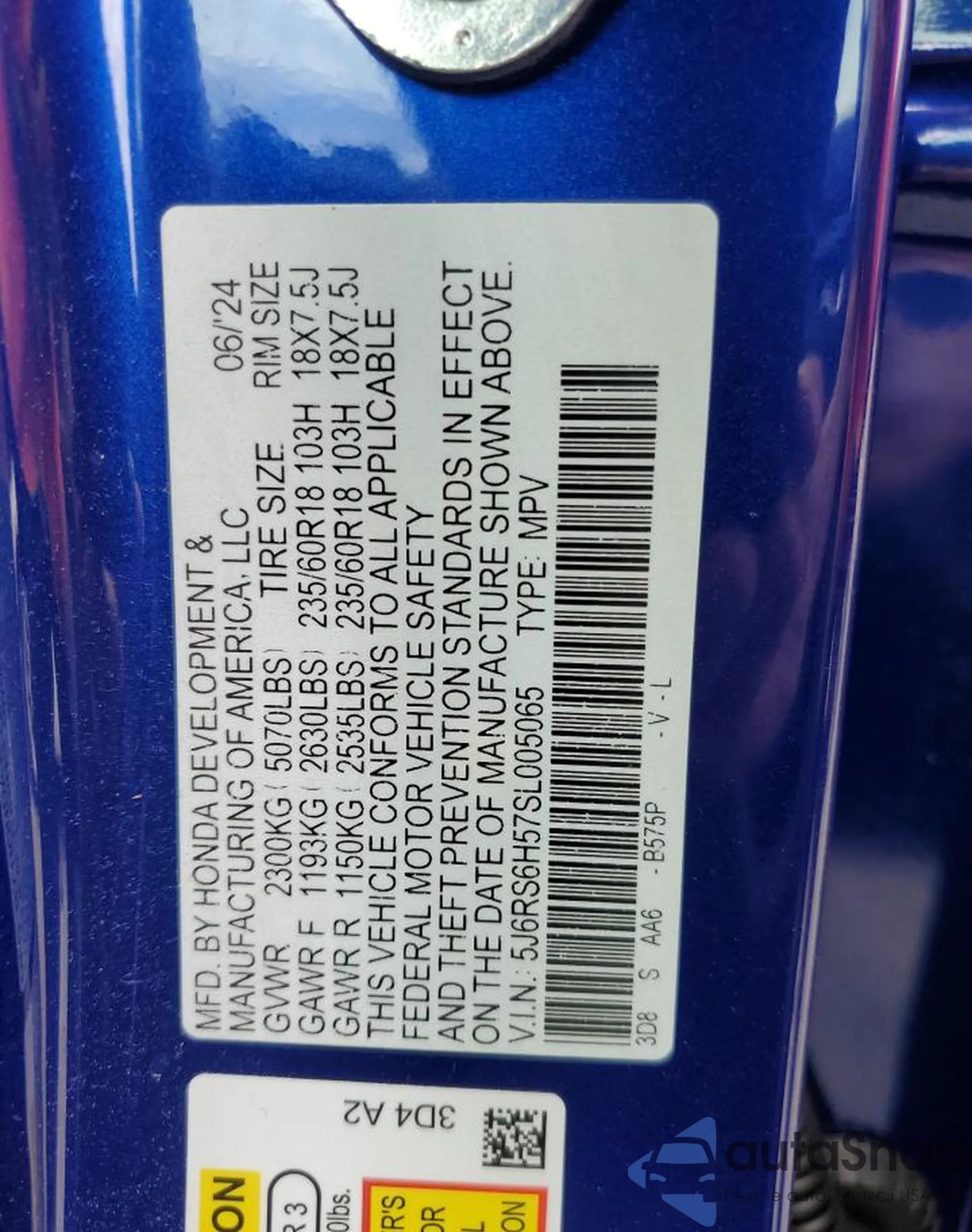 VIN: 5J6RS6H57SL005065