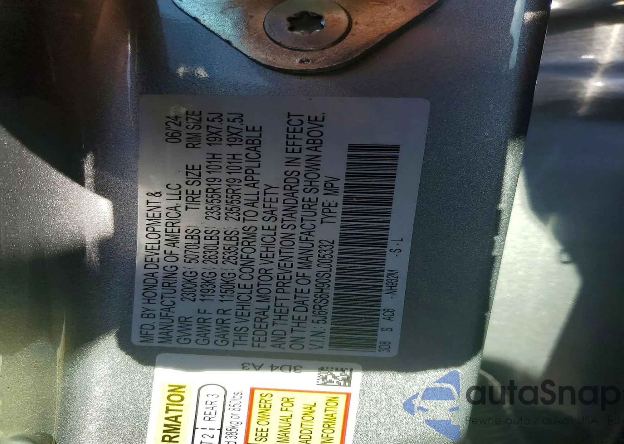 VIN: 5J6RS6H90SL005332