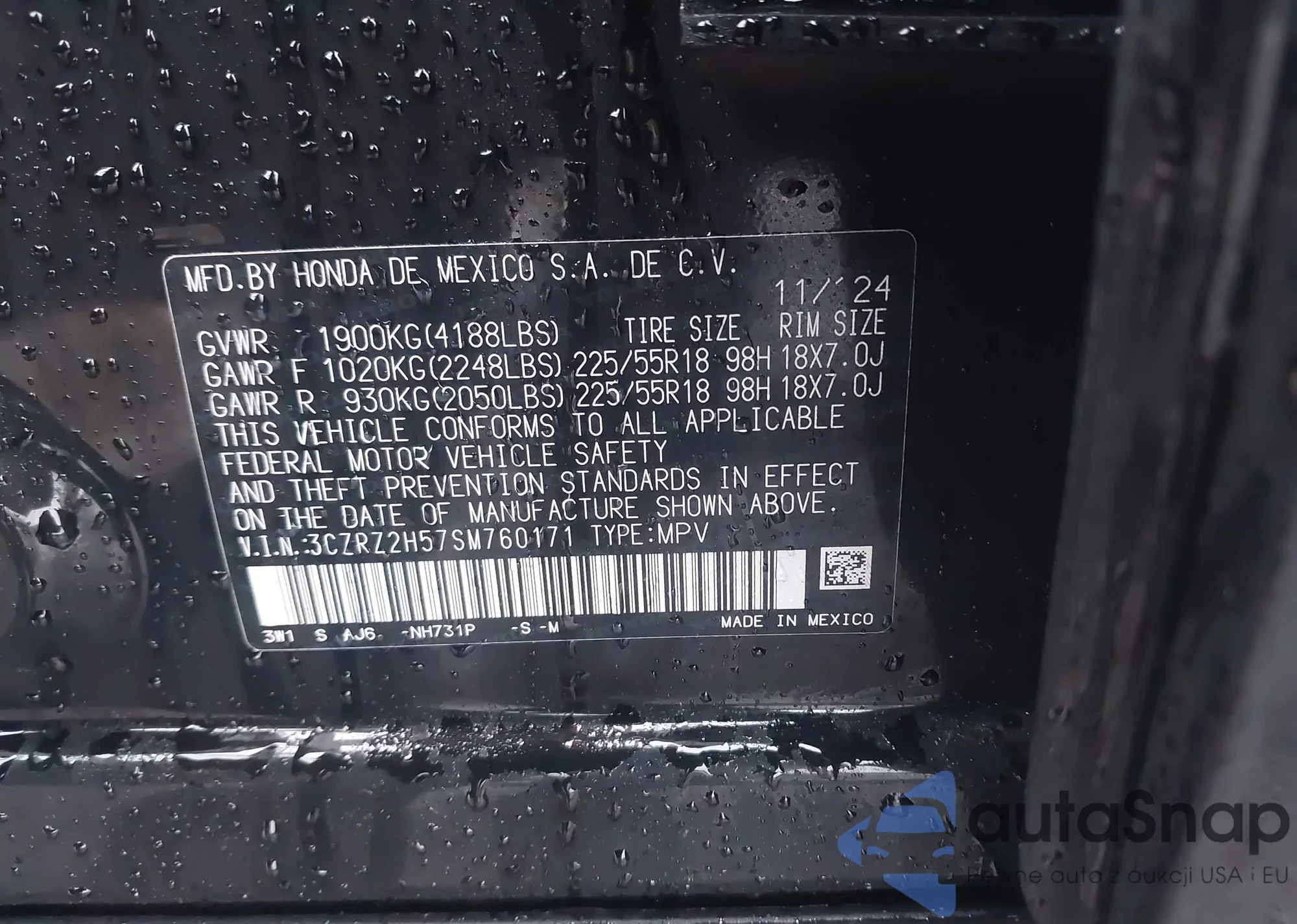The car Honda HR-V 2025 (VIN 3CZRZ2H57SM760171) has not been auctioned before. The documents are clean, and the mileage matches or is below the market average. Sold by an insurance company – we recommend purchase. Delivery to the port will take approx. 6–8 weeks.