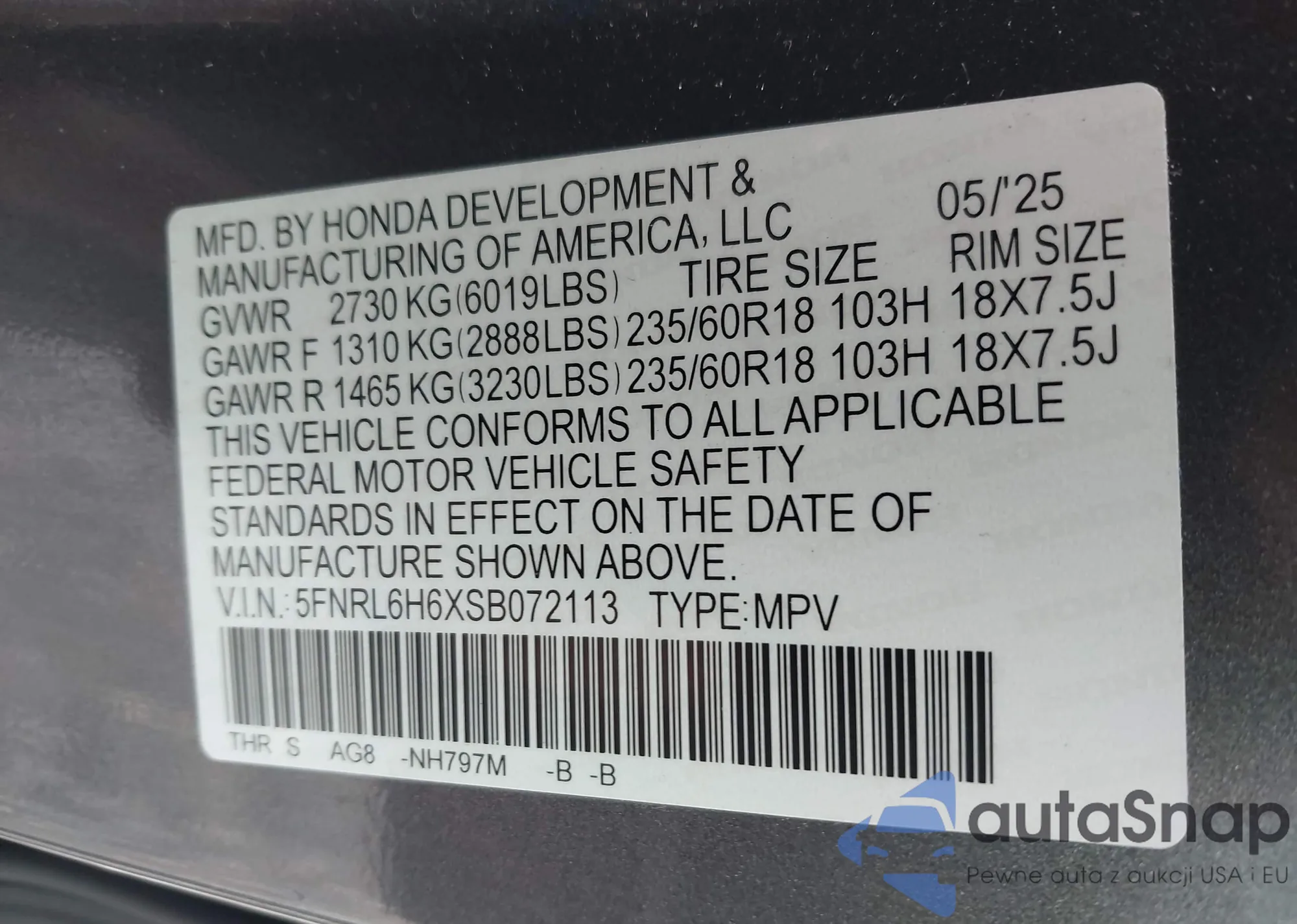 VIN: 5FNRL6H6XSB072113