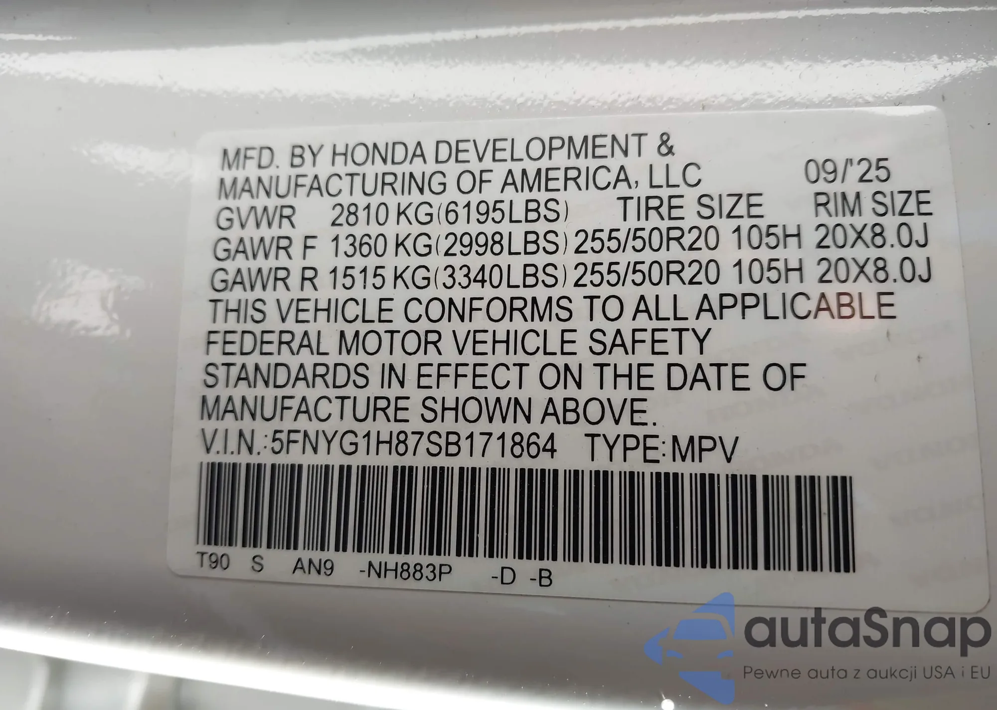 The car Honda Pilot 2025 (VIN 5FNYG1H87SB171864) has not been auctioned before. The documents are clean, and the mileage matches or is below the market average. Sold by an insurance company – we recommend purchase. Delivery to the port will take approx. 6–8 weeks.