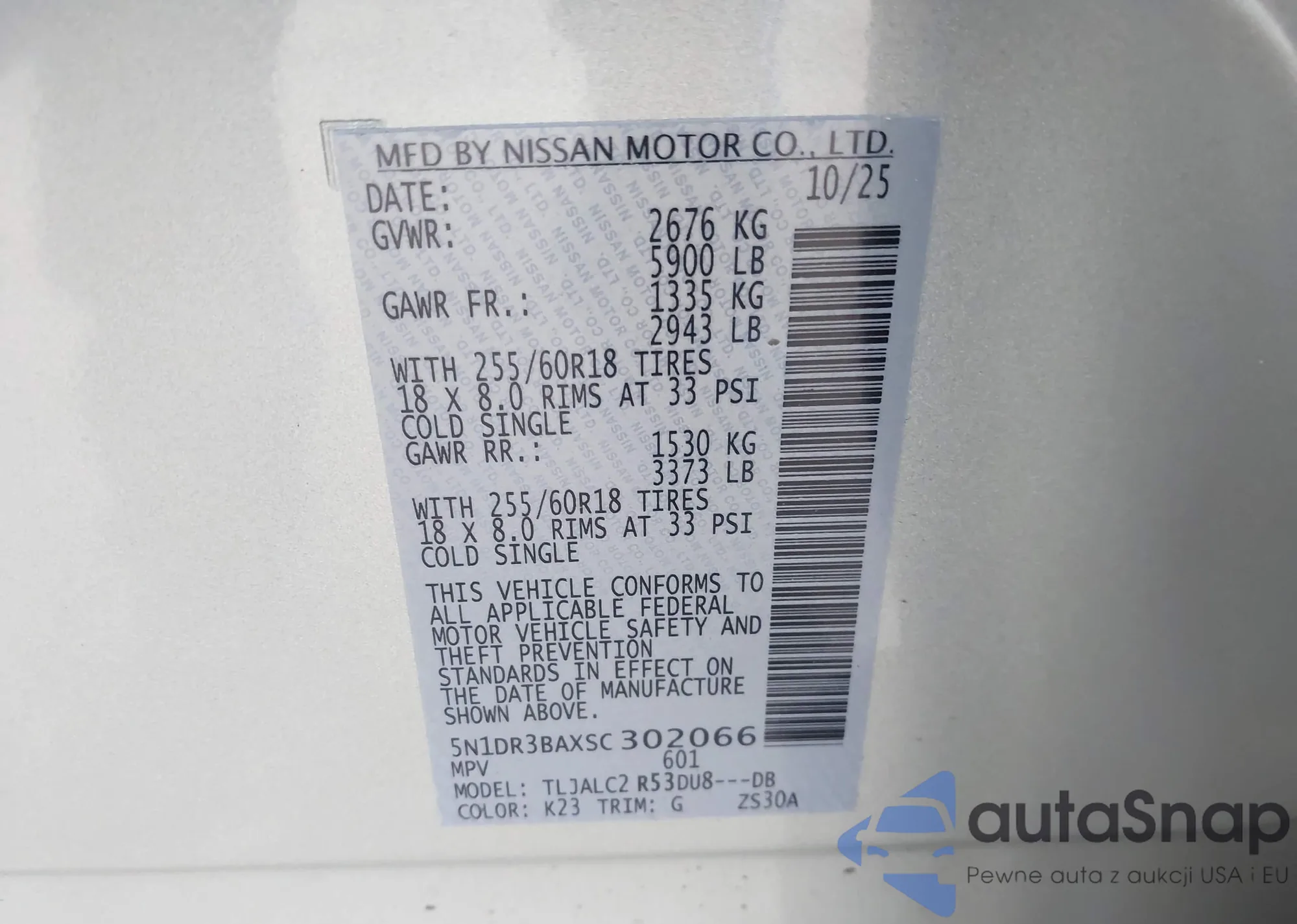 The car Nissan Pathfinder 2025 (VIN 5N1DR3BAXSC302066) has not been auctioned before. The documents are clean, and the mileage matches or is below the market average. Sold by an insurance company – we recommend purchase. Delivery to the port will take approx. 6–8 weeks.