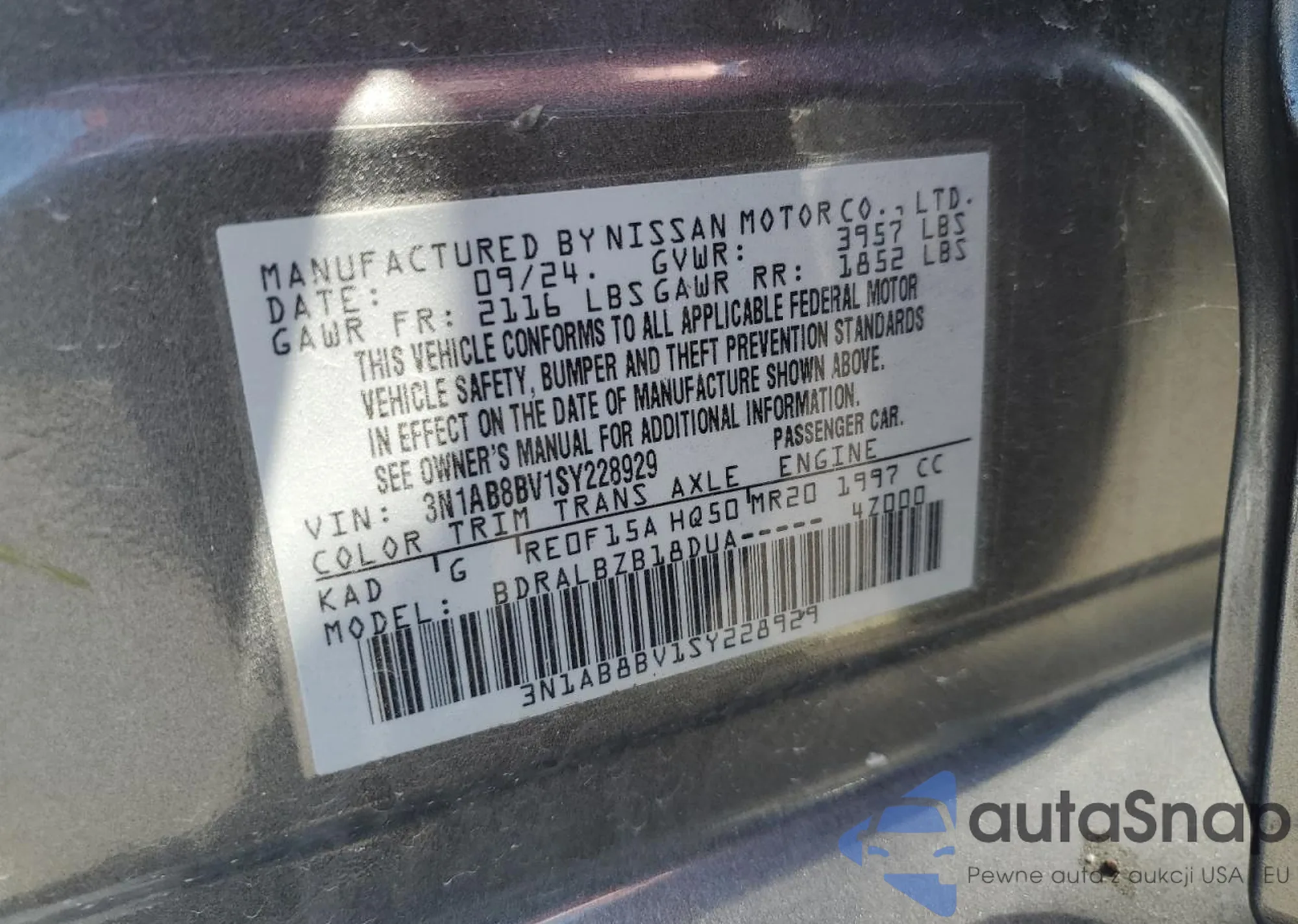 VIN: 3N1AB8BV1SY228929
