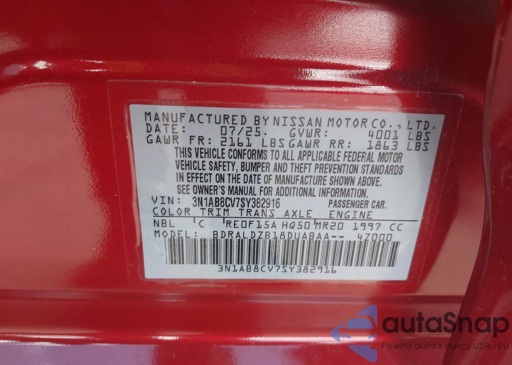 The car Nissan Sentra 2025 (VIN 3N1AB8CV7SY382916) is sold by an unverified seller. We recommend checking the Carfax report and confirming registration possibilities before purchase.