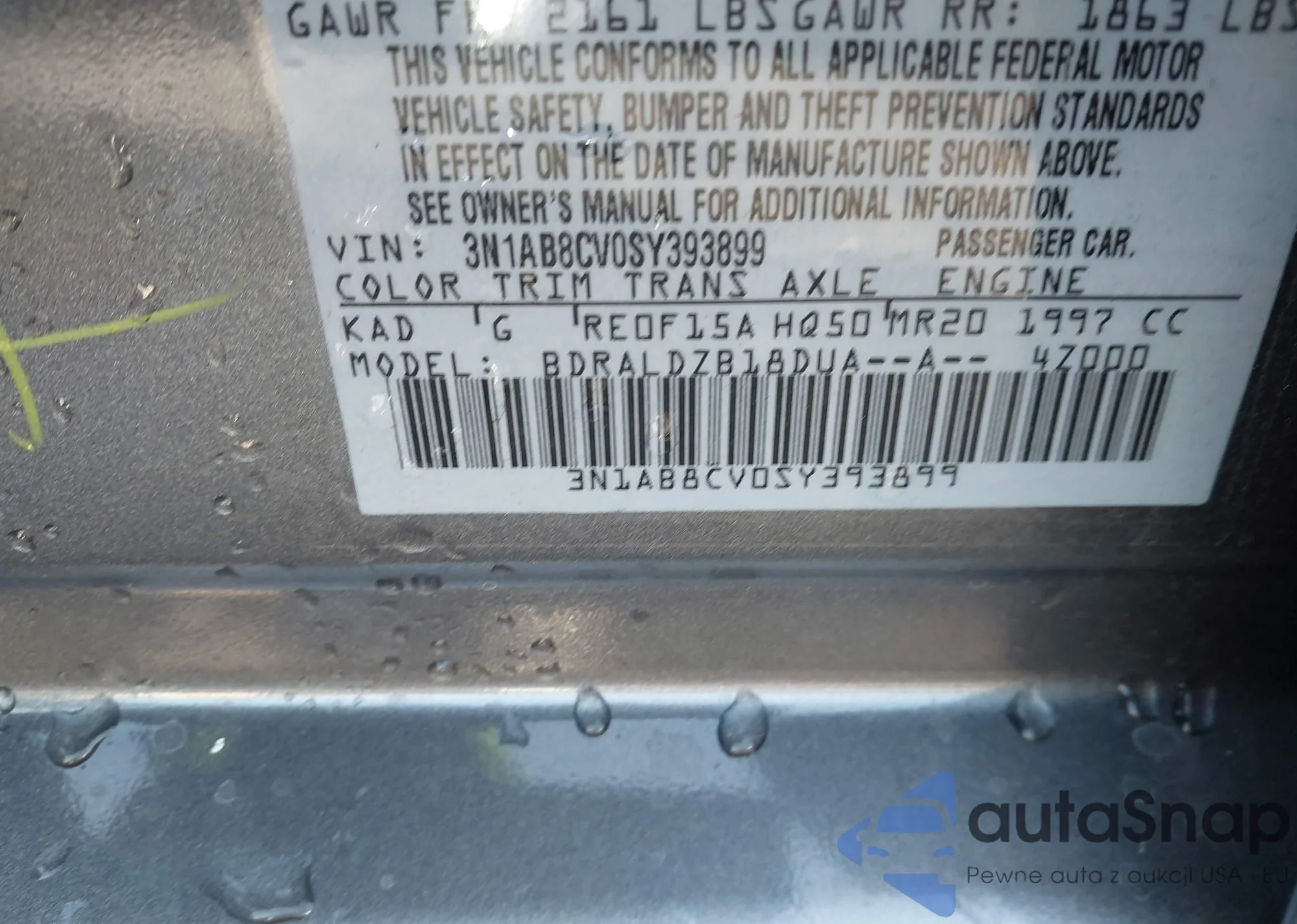 VIN: 3N1AB8CV0SY393899
