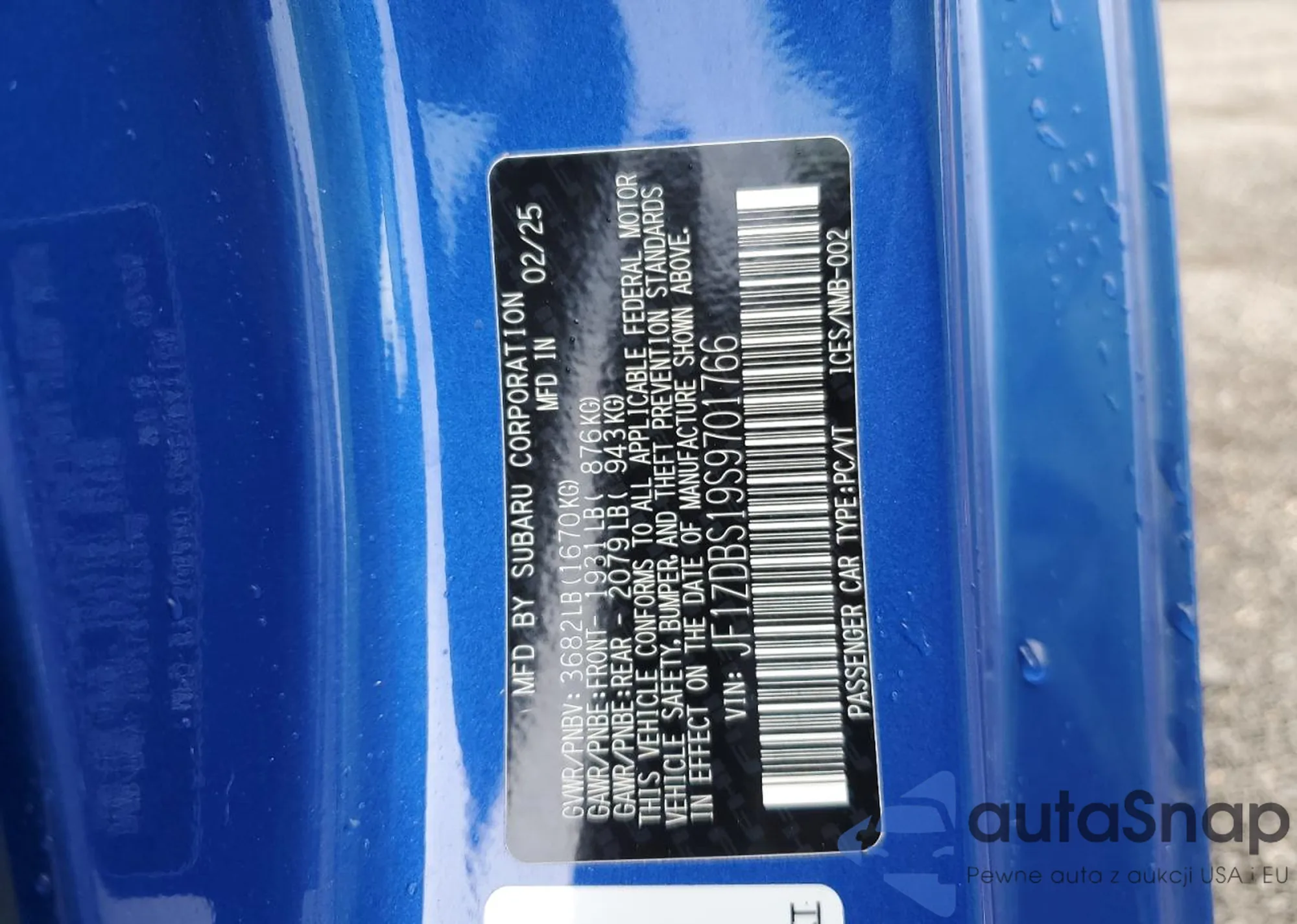 The car Subaru BRZ 2025 (VIN JF1ZDBS19S9701766) has documents that prevent registration. Export and registration may be difficult. Contact AutaSnap experts to find alternatives.