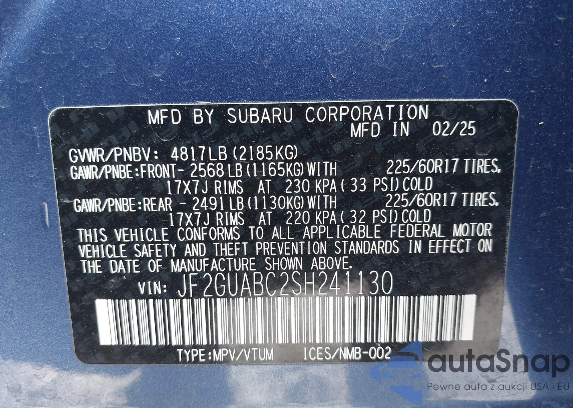 The car Subaru XV 2025 (VIN JF2GUABC2SH241130) has not been auctioned before. The documents are clean, and the mileage matches or is below the market average. Sold by an insurance company – we recommend purchase. Delivery to the port will take approx. 6–8 weeks.