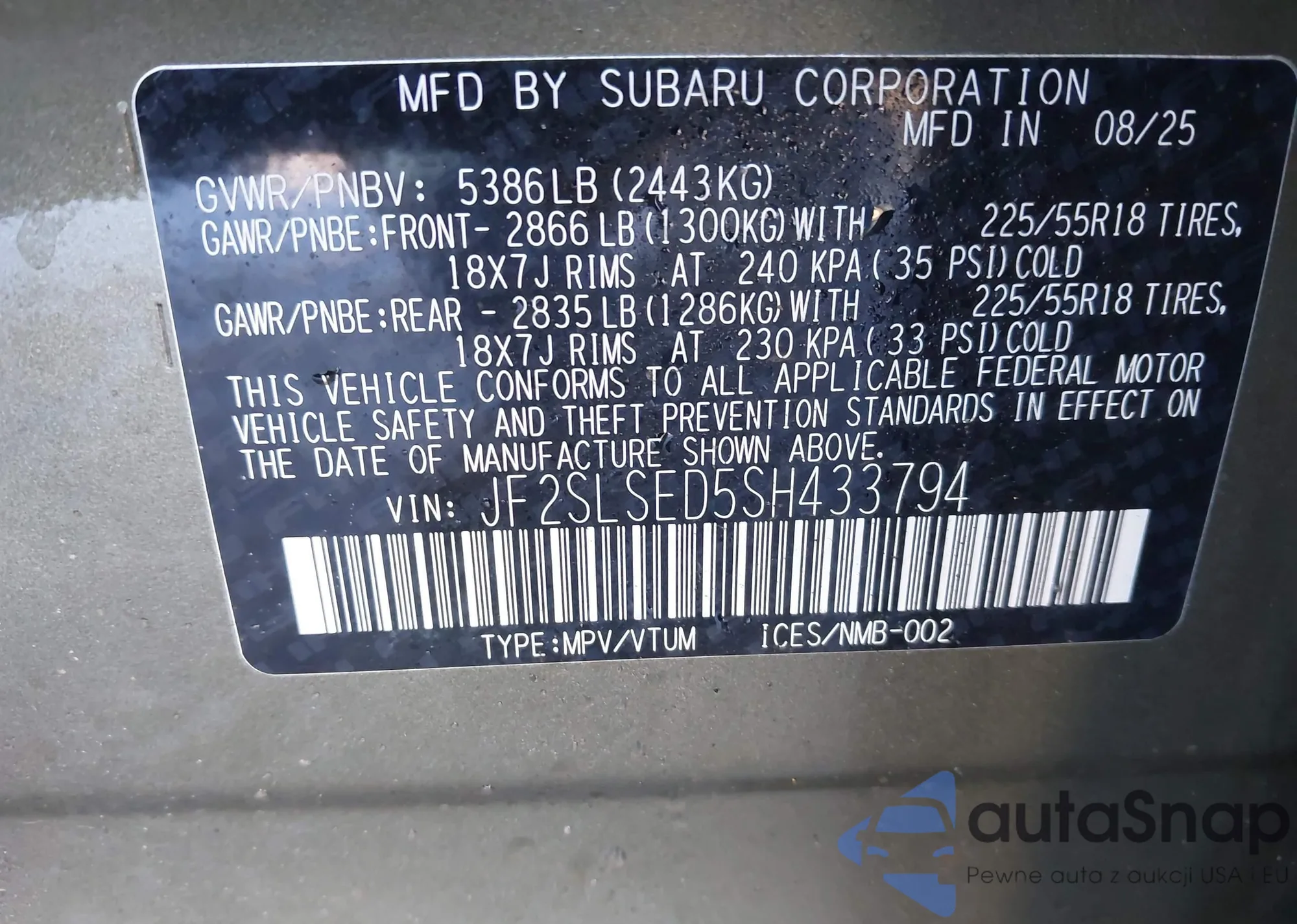 The car Subaru Forester 2025 (VIN JF2SLSED5SH433794) has not been auctioned before. The documents are clean, and the mileage matches or is below the market average. Sold by an insurance company – we recommend purchase. Delivery to the port will take approx. 6–8 weeks.