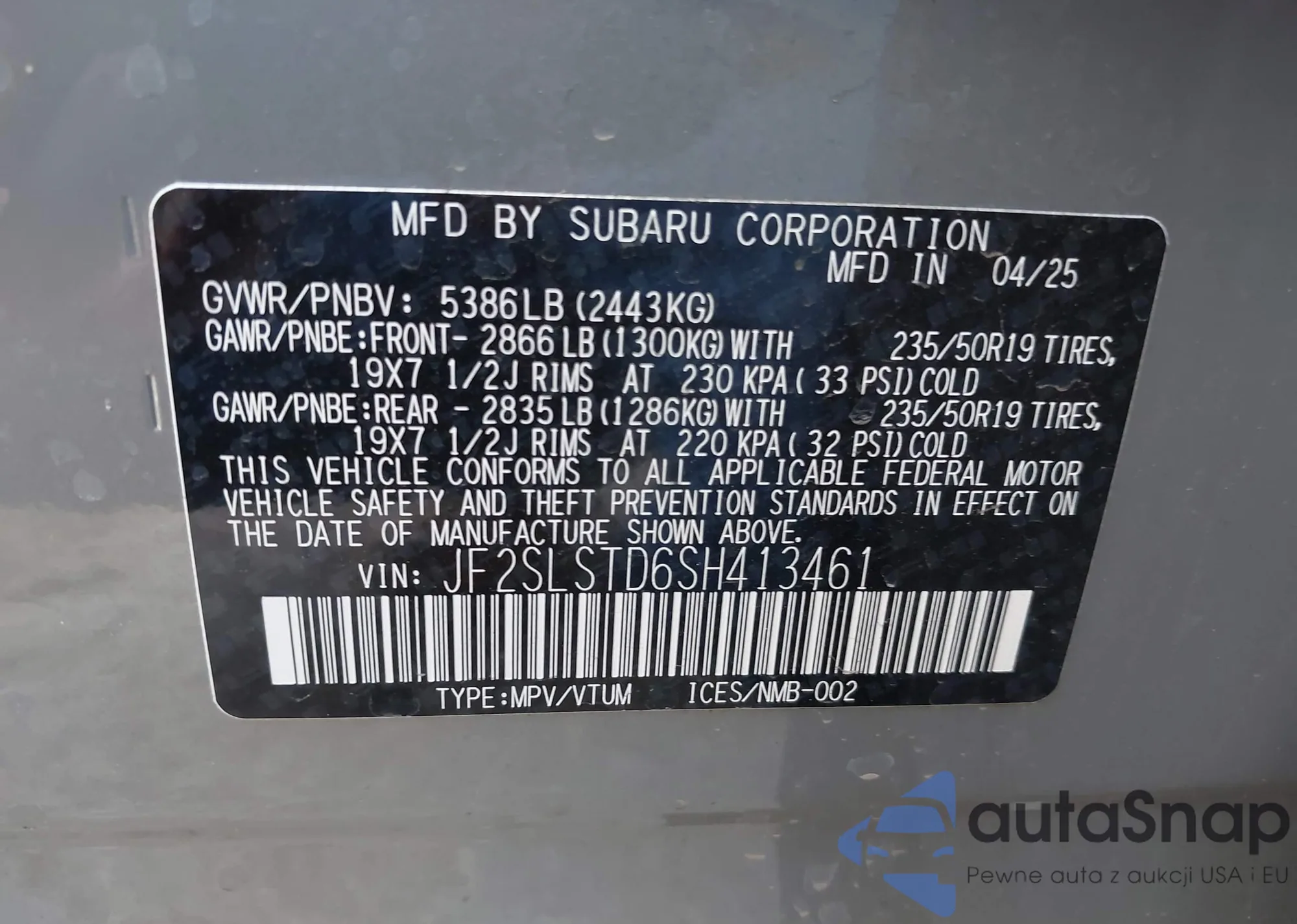 The car Subaru Forester 2025 (VIN JF2SLSTD6SH413461) has not been auctioned before. The documents are clean, and the mileage matches or is below the market average. Sold by an insurance company – we recommend purchase. Delivery to the port will take approx. 6–8 weeks.