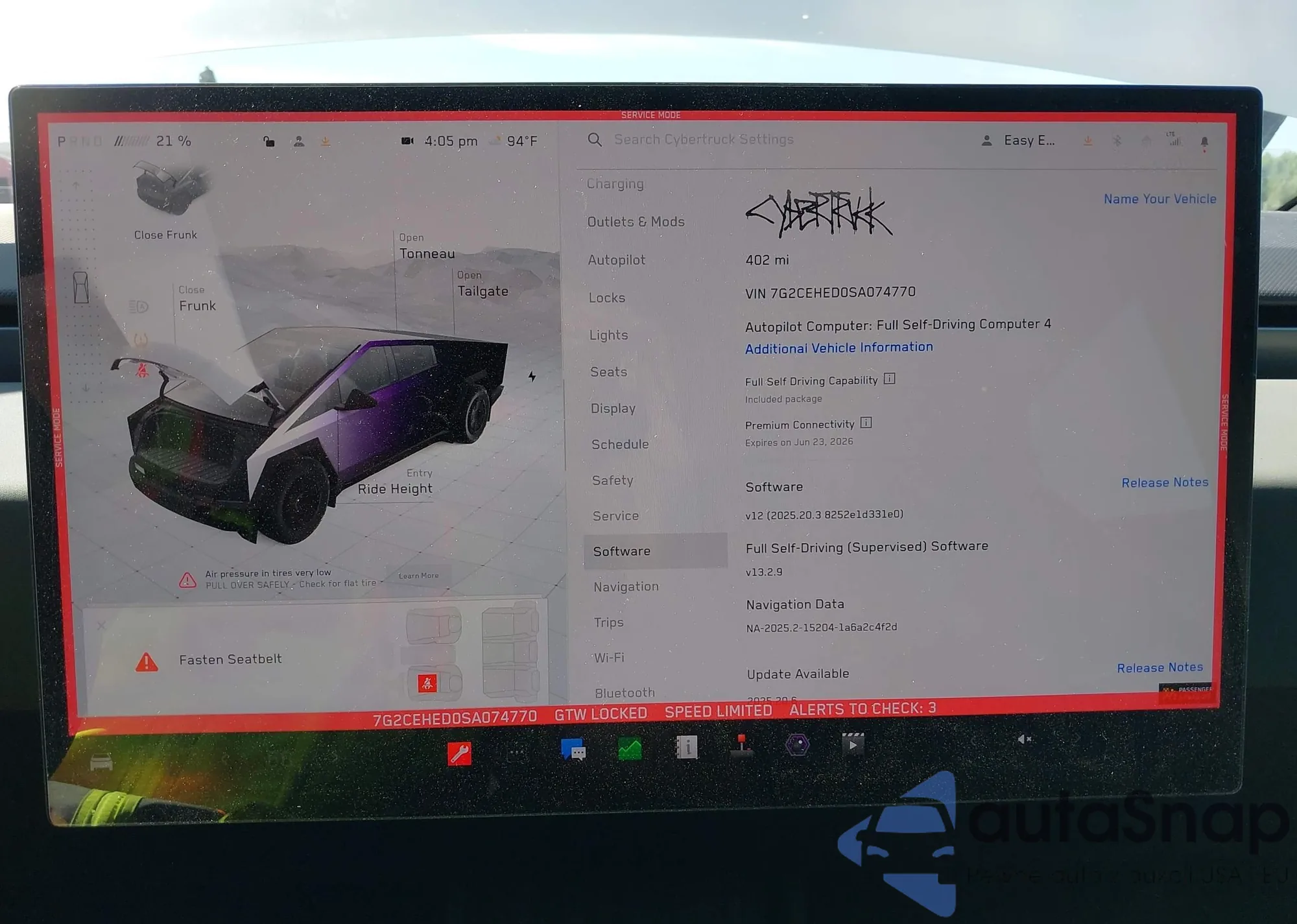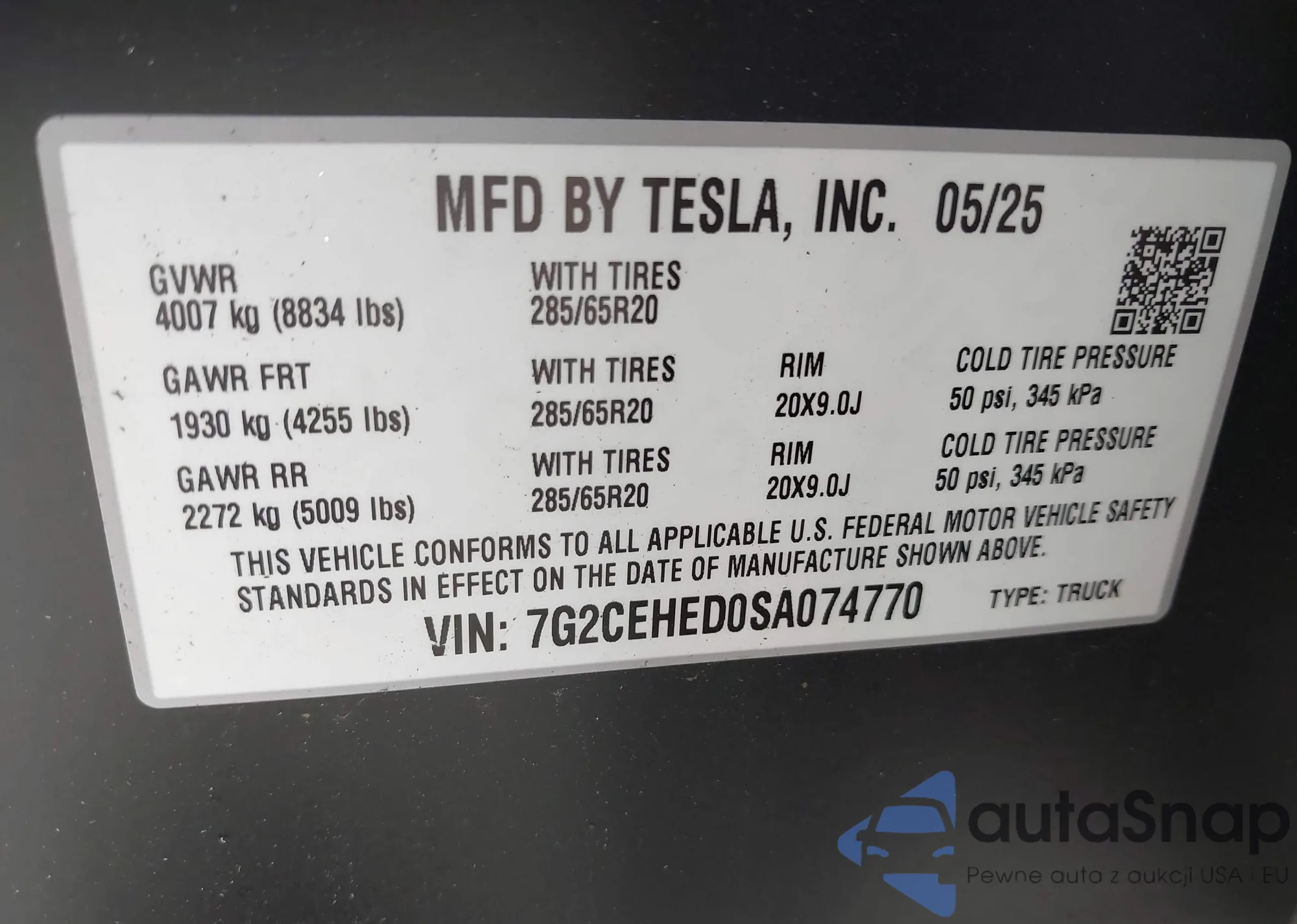 The car Tesla Cybertruck 2025 (VIN 7G2CEHED0SA074770) has documents that prevent registration. Export and registration may be difficult. Contact AutaSnap experts to find alternatives.