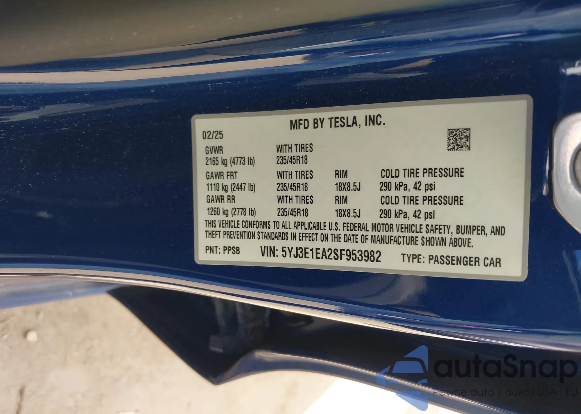 VIN: 5YJ3E1EA2SF953982