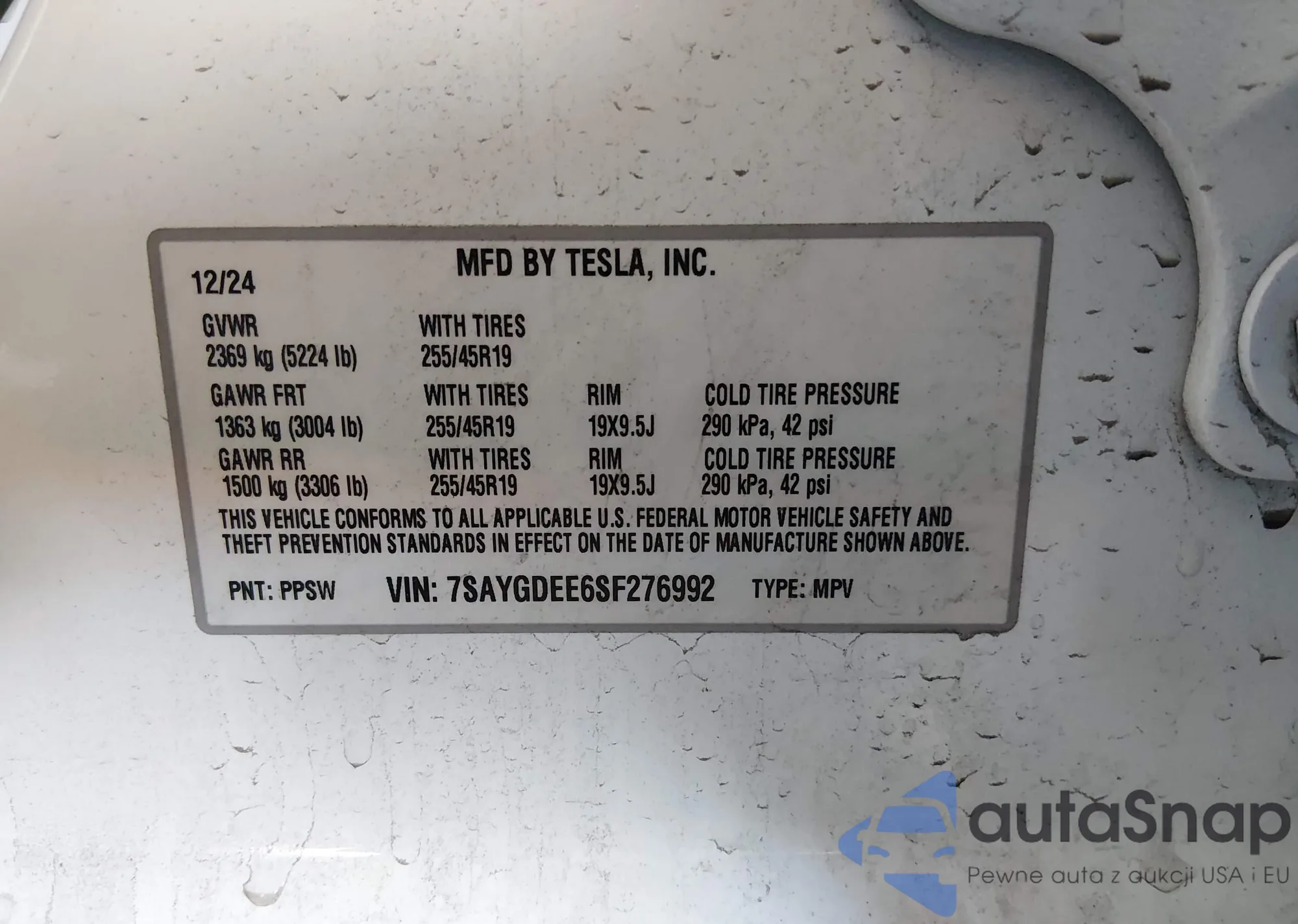 The car Tesla Model Y 2025 (VIN 7SAYGDEE6SF276992) has not been auctioned before. The documents are clean, and the mileage matches or is below the market average. Sold by an insurance company – we recommend purchase. Delivery to the port will take approx. 6–8 weeks.