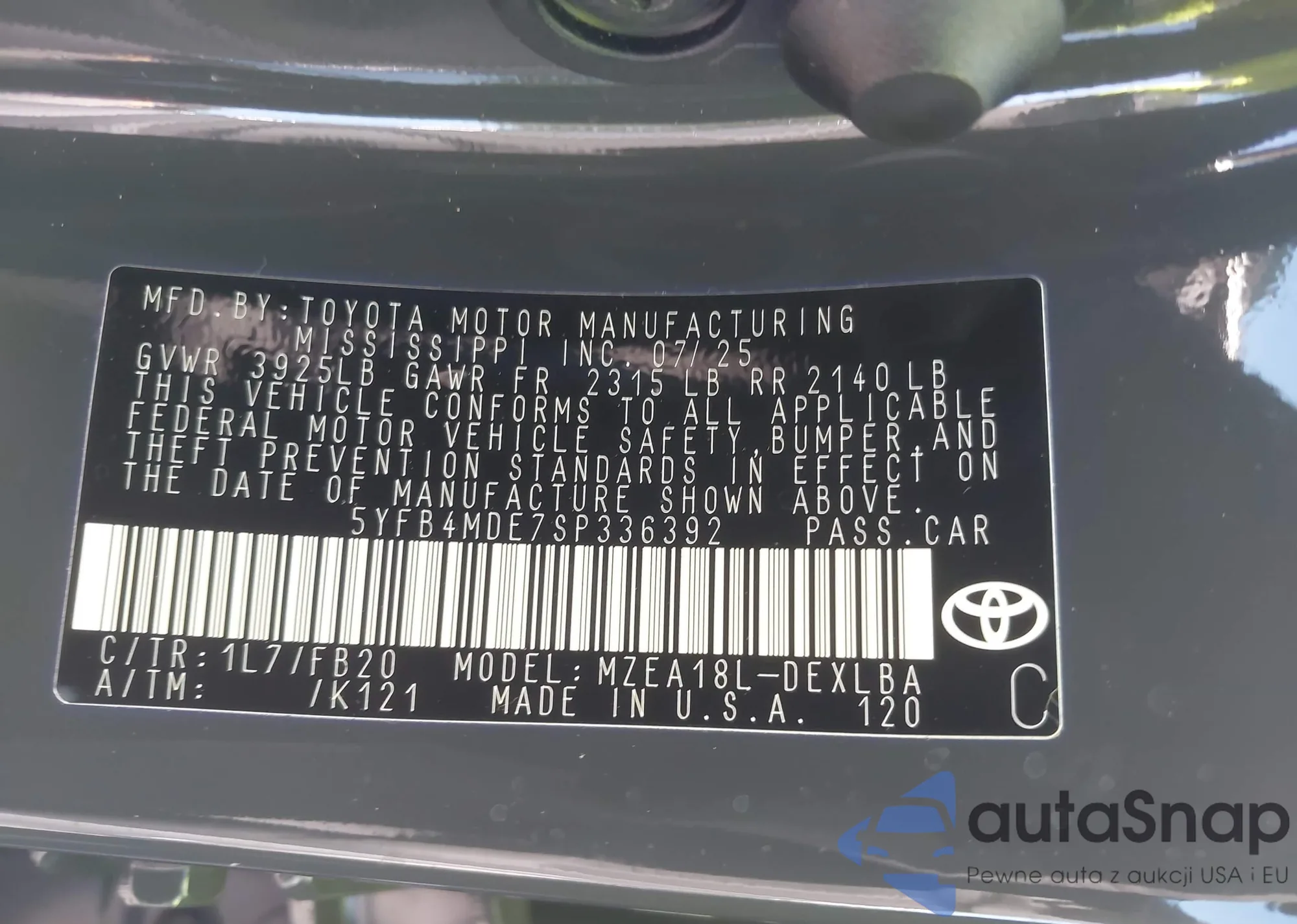 The car Toyota Corolla 2025 (VIN 5YFB4MDE7SP336392) has not been auctioned before. The documents are clean, and the mileage matches or is below the market average. Sold by an insurance company – we recommend purchase. Delivery to the port will take approx. 6–8 weeks.