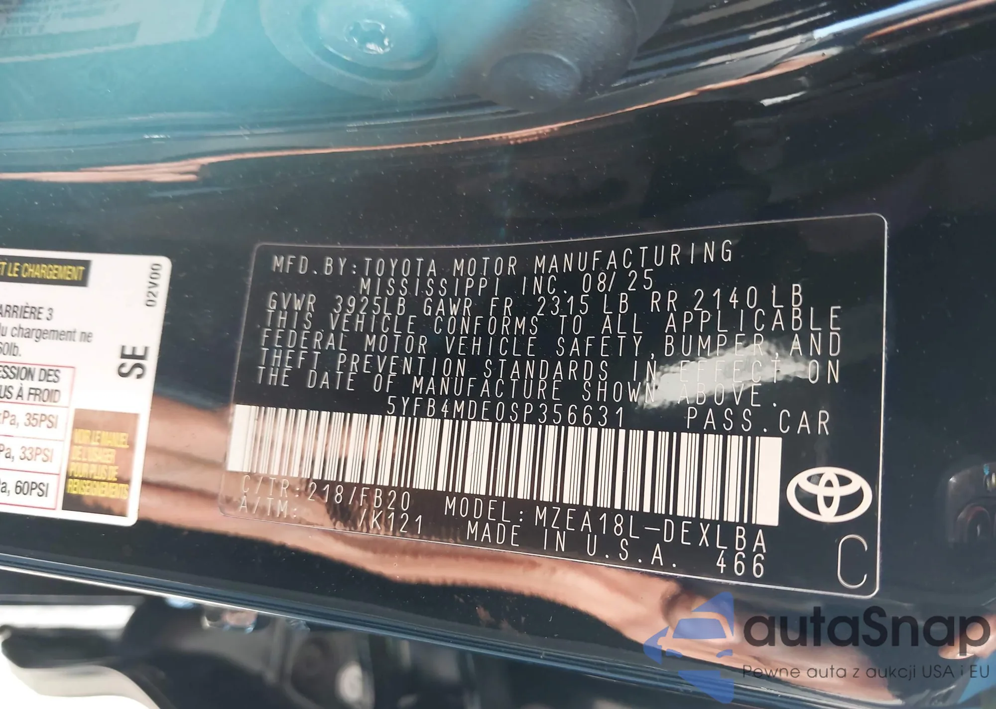 The car Toyota Corolla 2025 (VIN 5YFB4MDE0SP356631) has documents that prevent registration. Export and registration may be difficult. Contact AutaSnap experts to find alternatives.