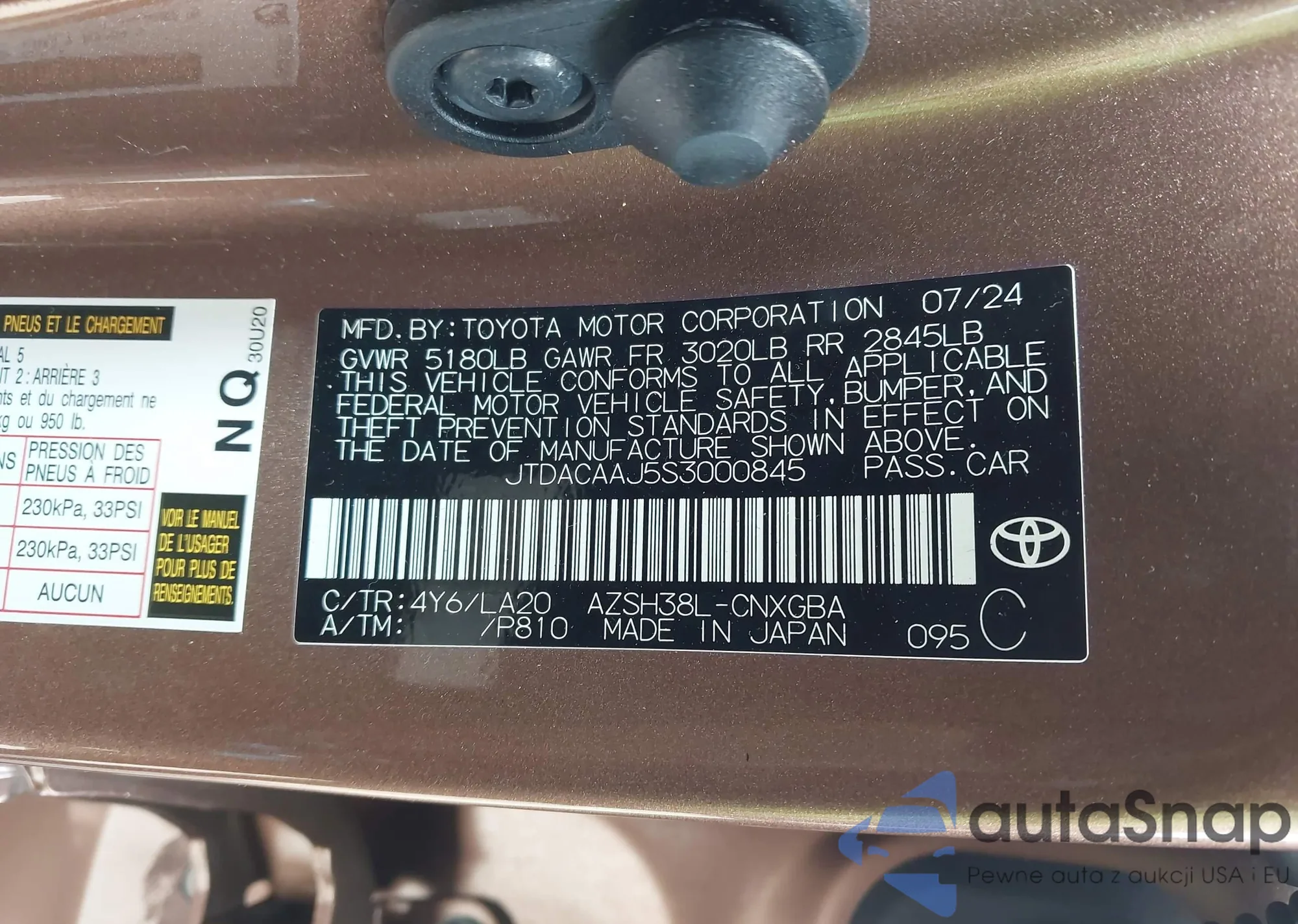 The car Toyota Crown Signia 2025 (VIN JTDACAAJ5S3000845) has documents that prevent registration. Export and registration may be difficult. Contact AutaSnap experts to find alternatives.