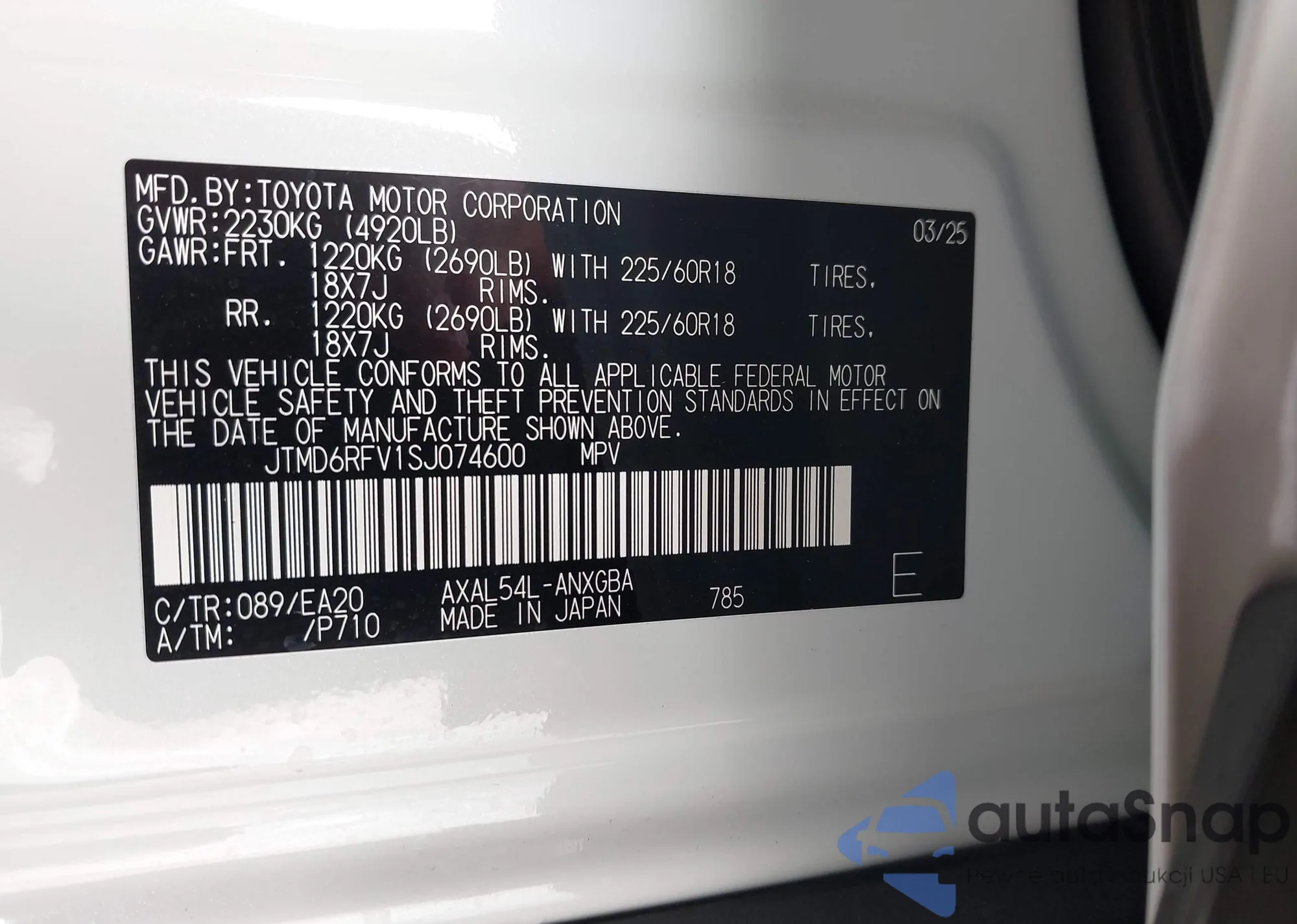 The car Toyota RAV 4 2025 (VIN JTMD6RFV1SJ074600) has not been auctioned before. The documents are clean, and the mileage matches or is below the market average. Sold by an insurance company – we recommend purchase. Delivery to the port will take approx. 6–8 weeks.