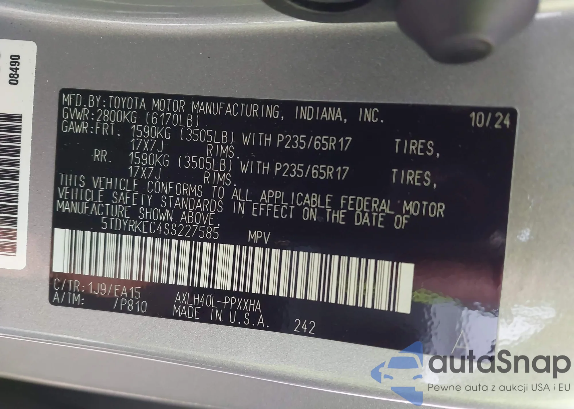 The car Toyota Sienna 2025 (VIN 5TDYRKEC4SS227585) has not been auctioned before. The documents are clean, and the mileage matches or is below the market average. Sold by an insurance company – we recommend purchase. Delivery to the port will take approx. 6–8 weeks.