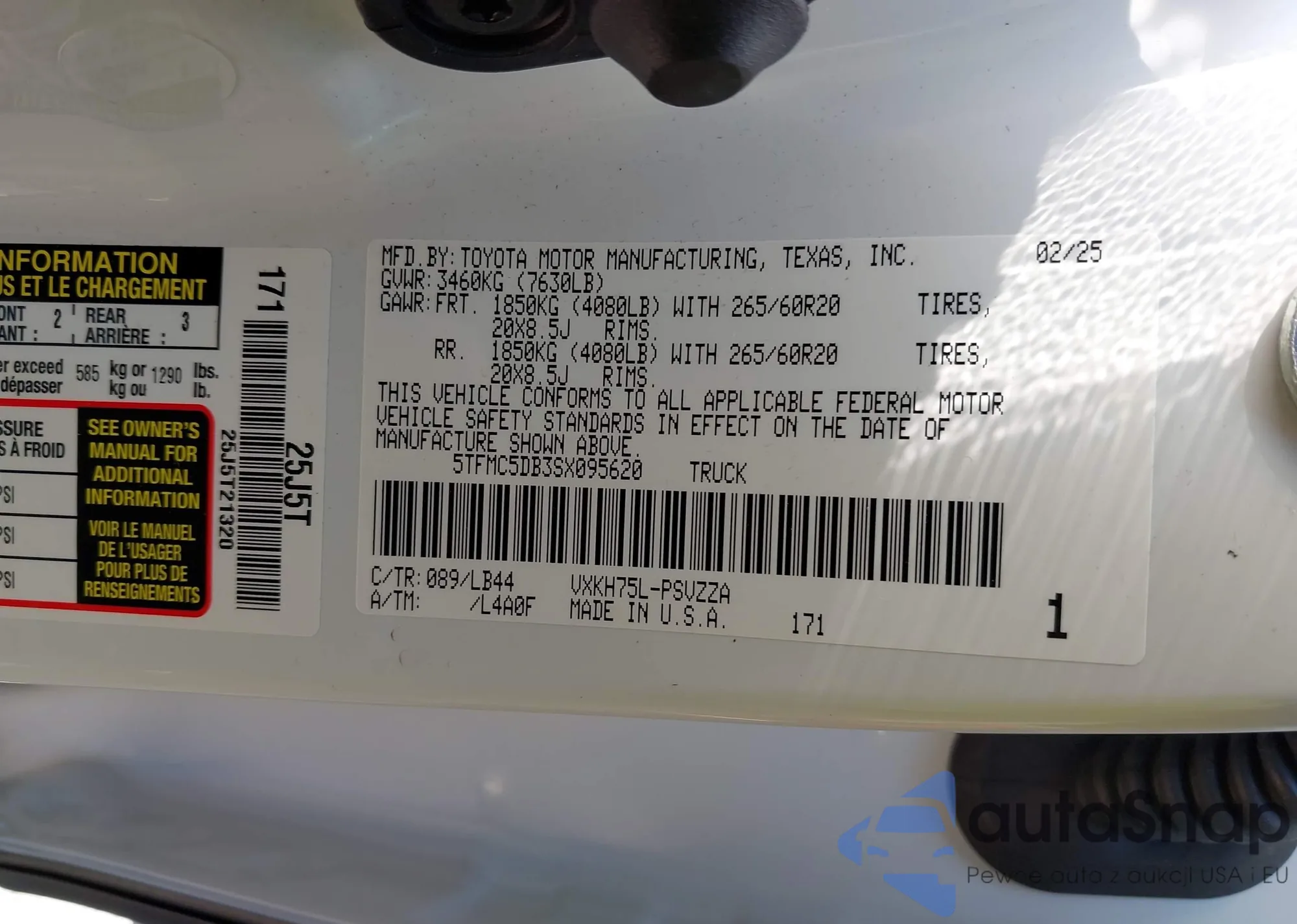 The car Toyota Tundra 2025 (VIN 5TFMC5DB3SX095620) has not been auctioned before. The documents are clean, and the mileage matches or is below the market average. Sold by an insurance company – we recommend purchase. Delivery to the port will take approx. 6–8 weeks.