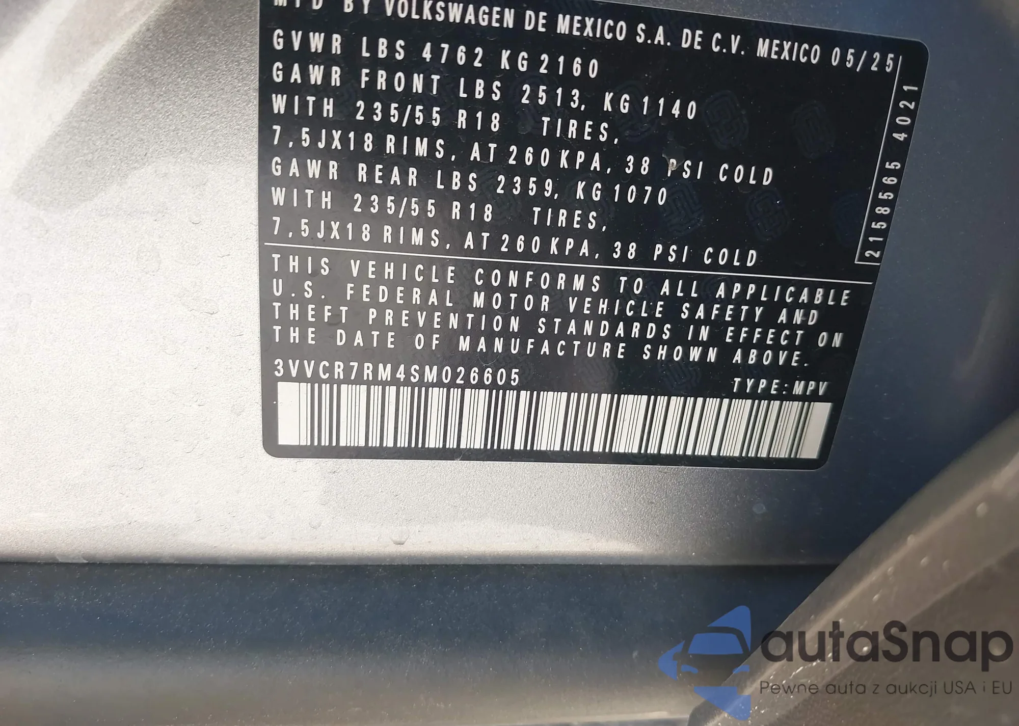 The car Volkswagen Tiguan 2025 (VIN 3VVCR7RM4SM026605) has not been auctioned before. The documents are clean, and the mileage matches or is below the market average. Sold by an insurance company – we recommend purchase. Delivery to the port will take approx. 6–8 weeks.