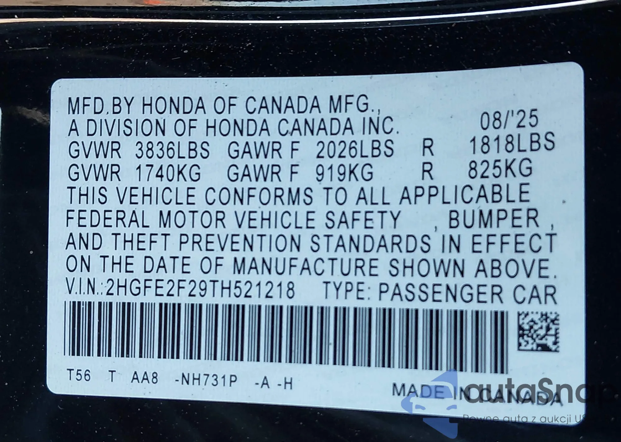 VIN: 2HGFE2F29TH521218