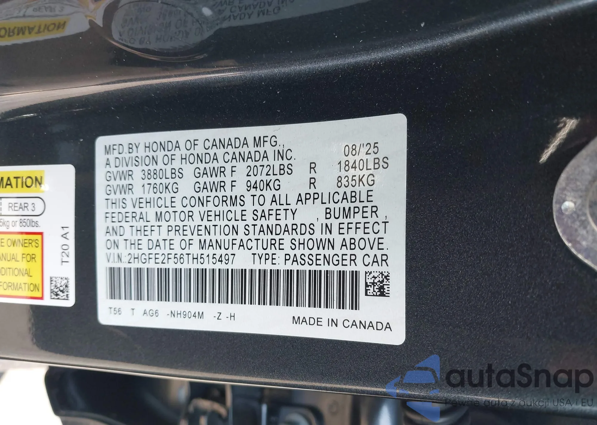 The car Honda Civic 2026 (VIN 2HGFE2F56TH515497) has not been auctioned before. The documents are clean, and the mileage matches or is below the market average. Sold by an insurance company – we recommend purchase. Delivery to the port will take approx. 6–8 weeks.