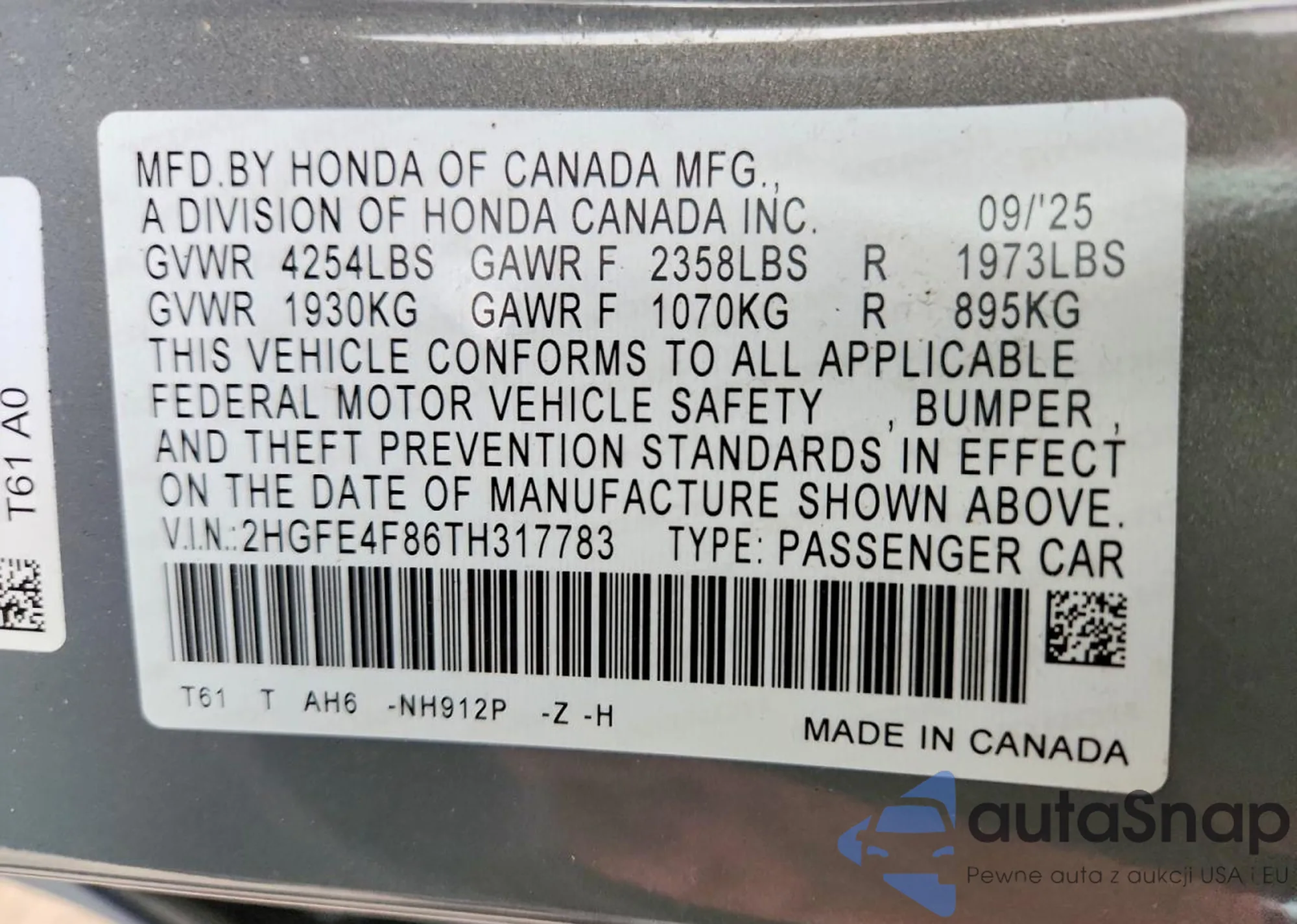 The car Honda Civic 2026 (VIN 2HGFE4F86TH317783) has not been auctioned before. The documents are clean, and the mileage matches or is below the market average. Sold by an insurance company – we recommend purchase. Delivery to the port will take approx. 6–8 weeks.