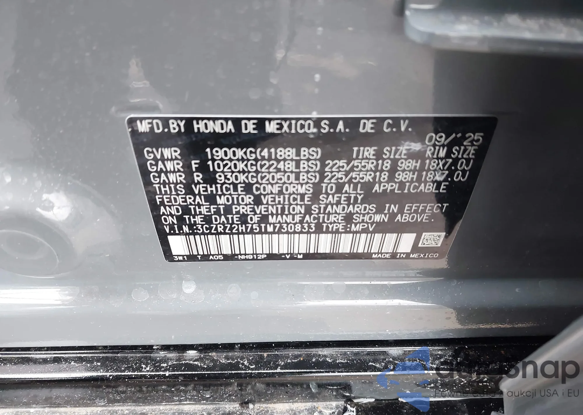The car Honda HR-V 2026 (VIN 3CZRZ2H75TM730833) has not been auctioned before. The documents are clean, and the mileage matches or is below the market average. Sold by an insurance company – we recommend purchase. Delivery to the port will take approx. 6–8 weeks.