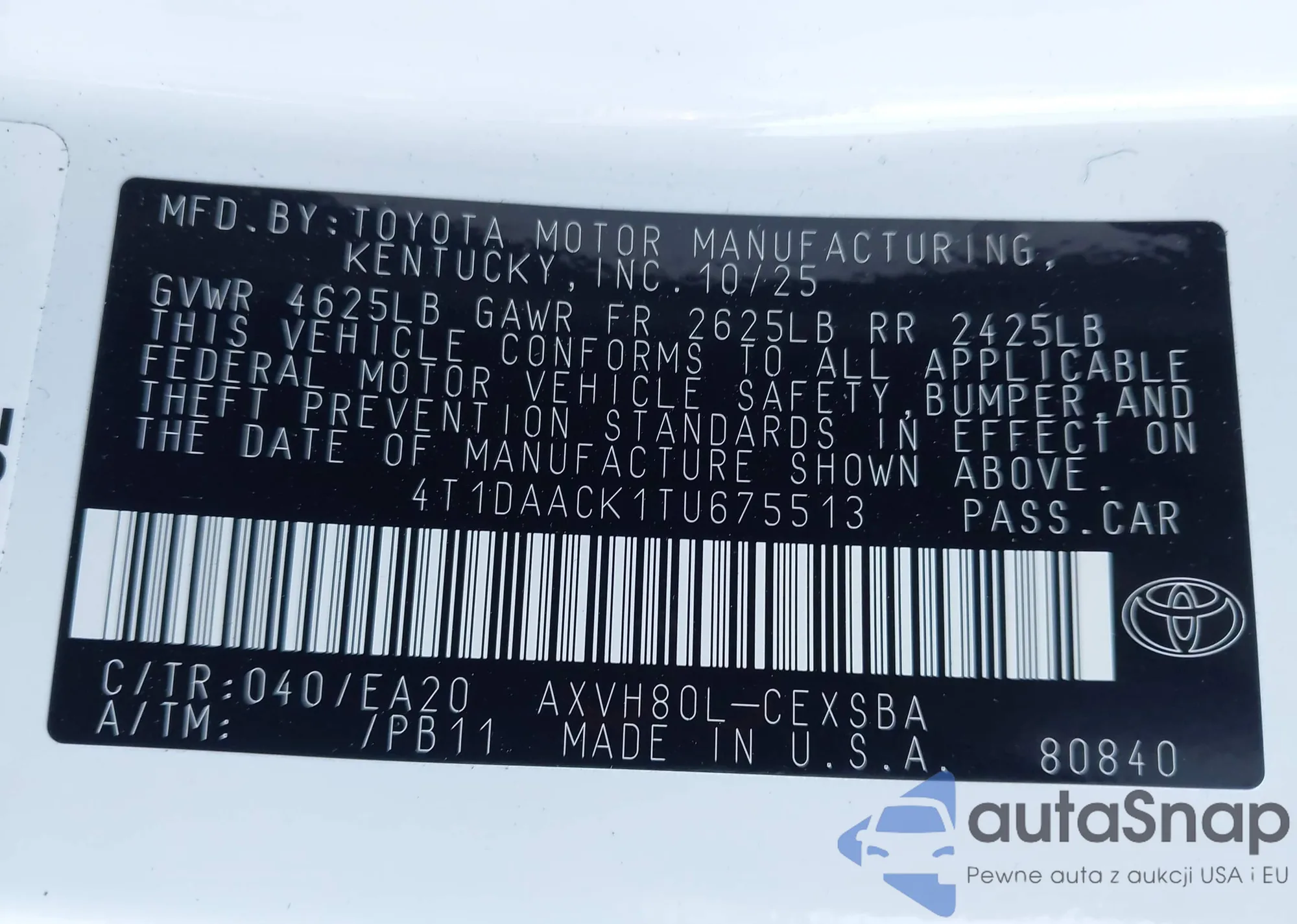 VIN: 4T1DAACK1TU675513