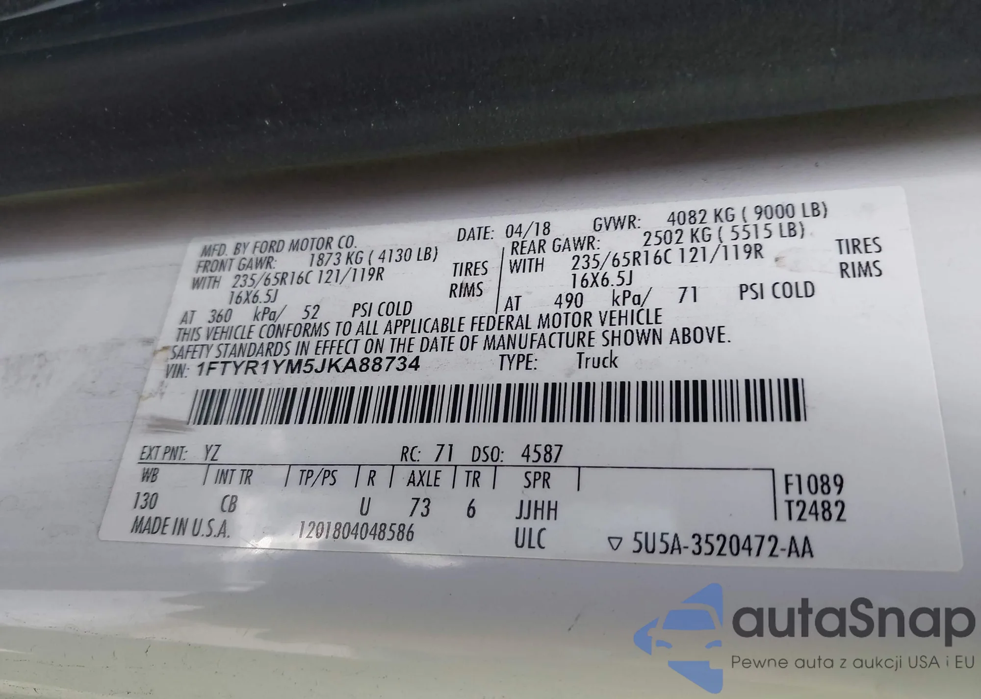 • VIN 1FTYR1YM5JKA88734
