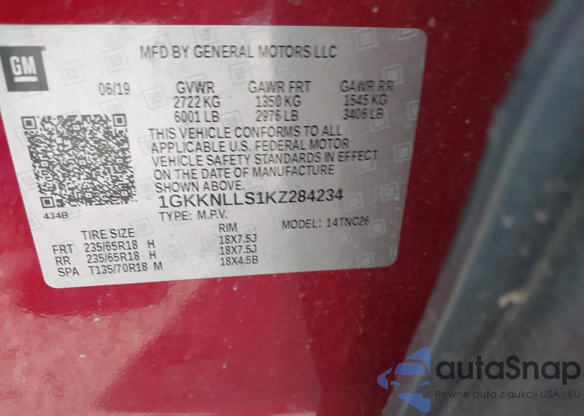 LOT: 43342022 VIN: 1GKKNLLS1KZ284234