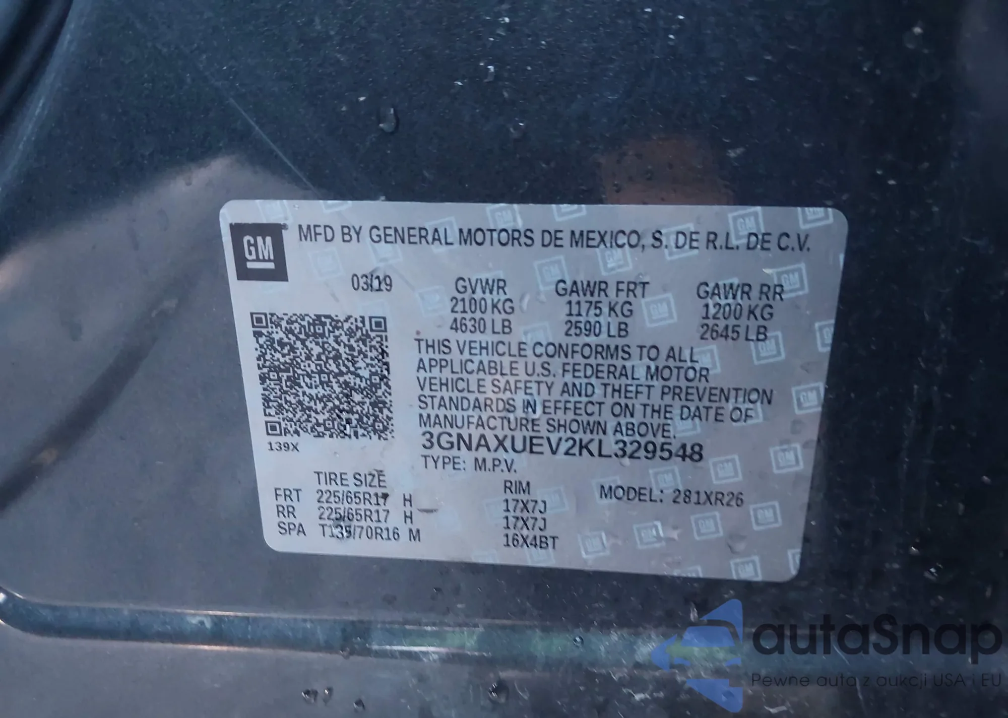 LOT: 43672730 VIN: 3GNAXUEV2KL329548