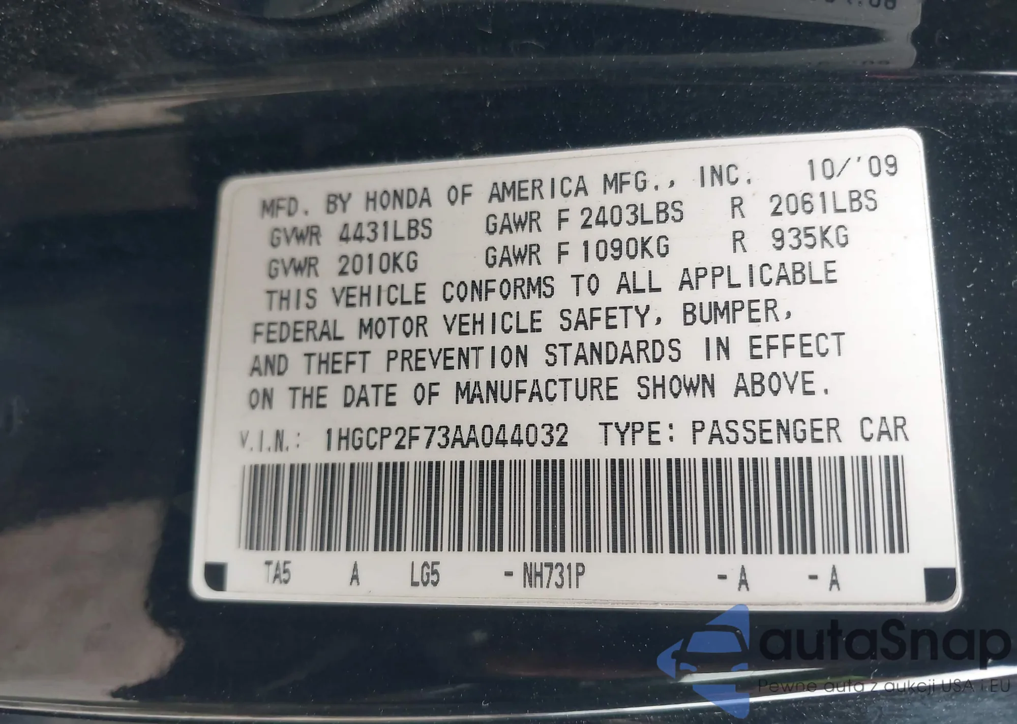 LOT: 43727400 VIN: 1HGCP2F73AA044032
