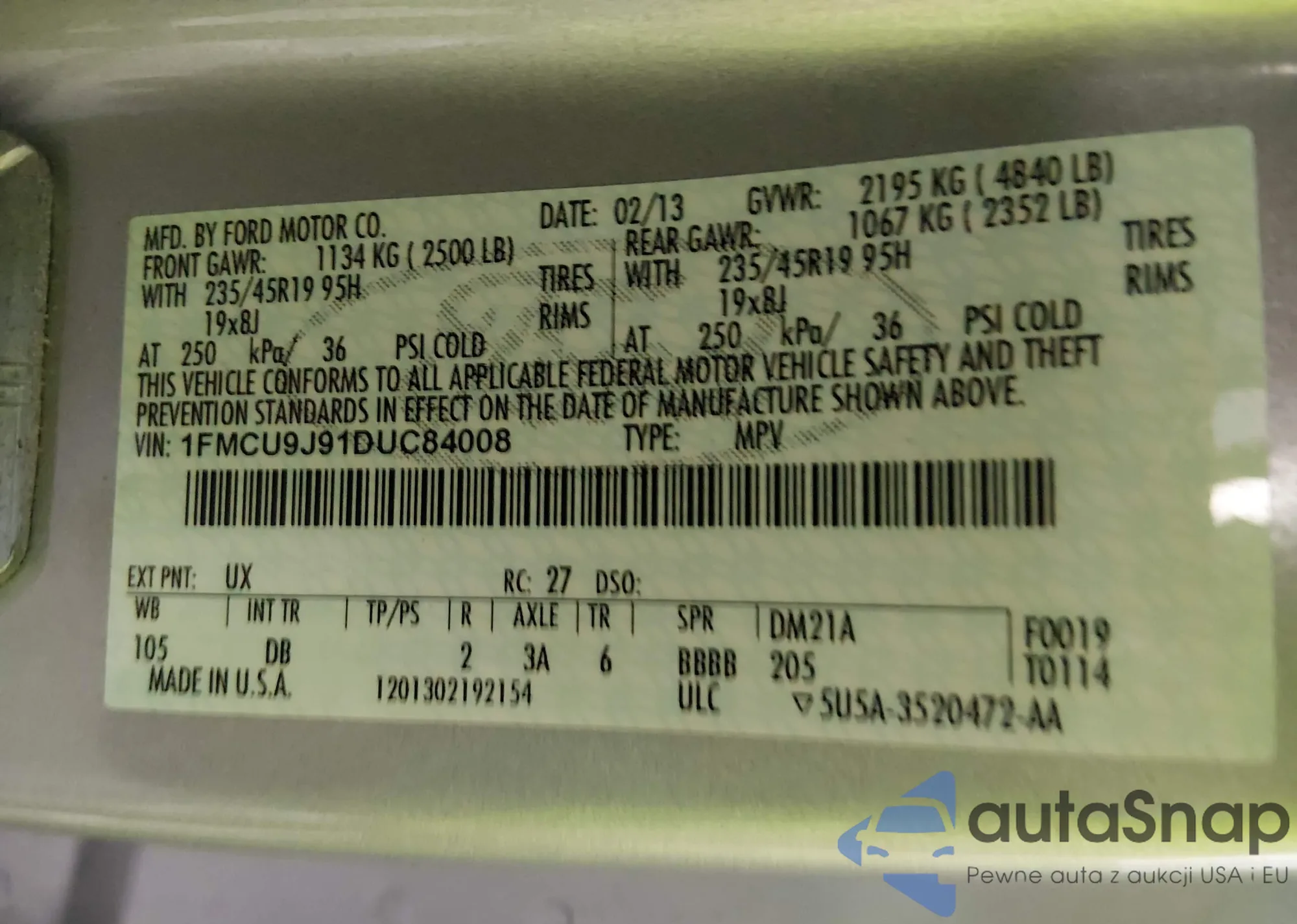LOT: 43983549 VIN: 1FMCU9J91DUC84008