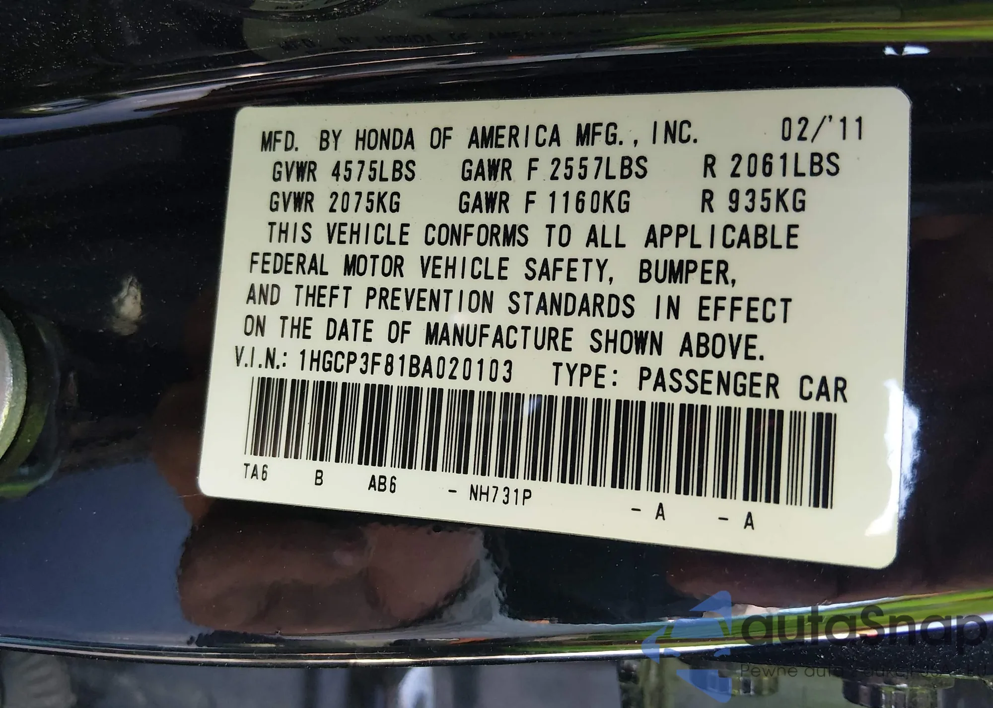 LOT: 44127185 VIN: 1HGCP3F81BA020103