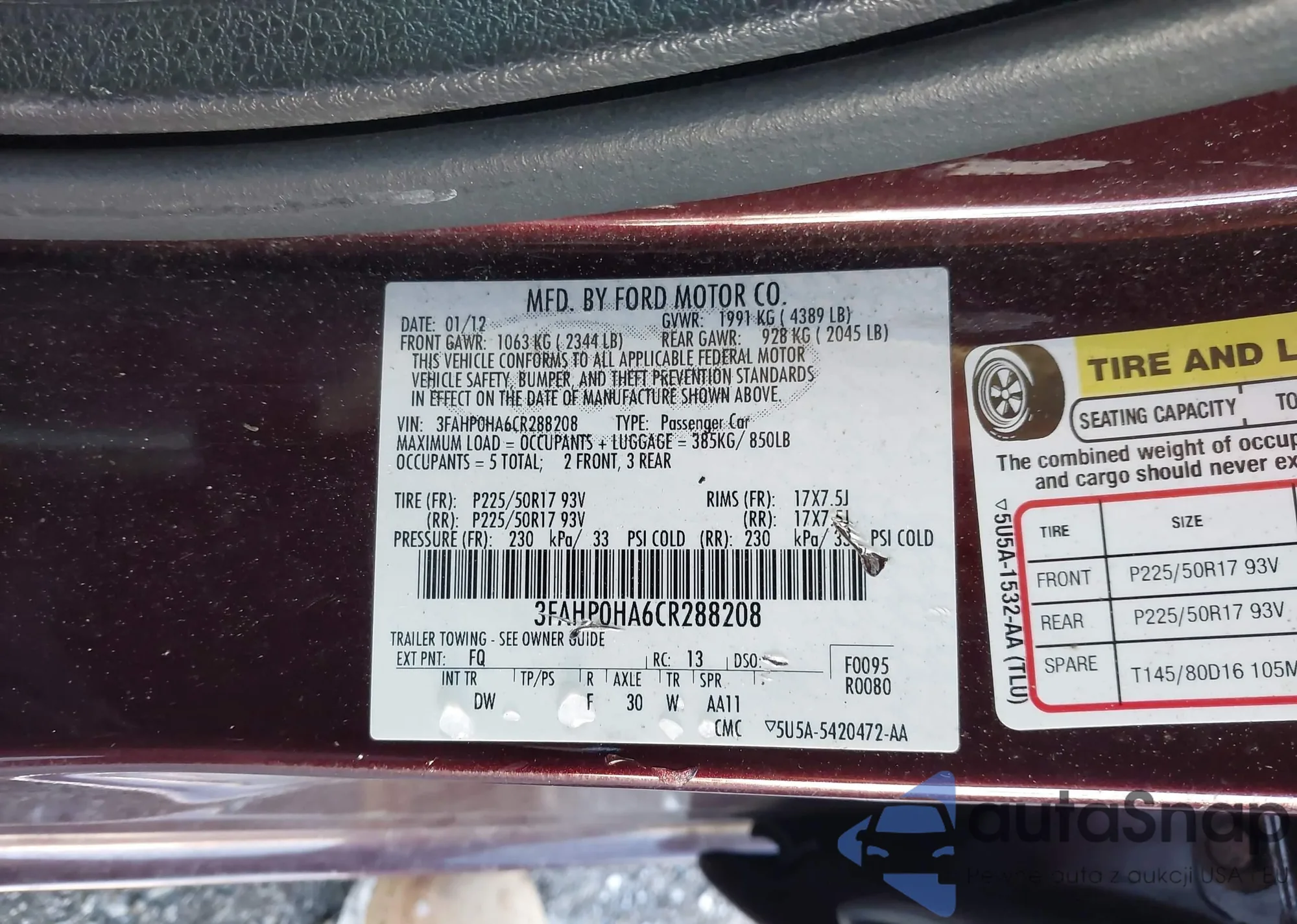 • VIN 3FAHP0HA6CR288208