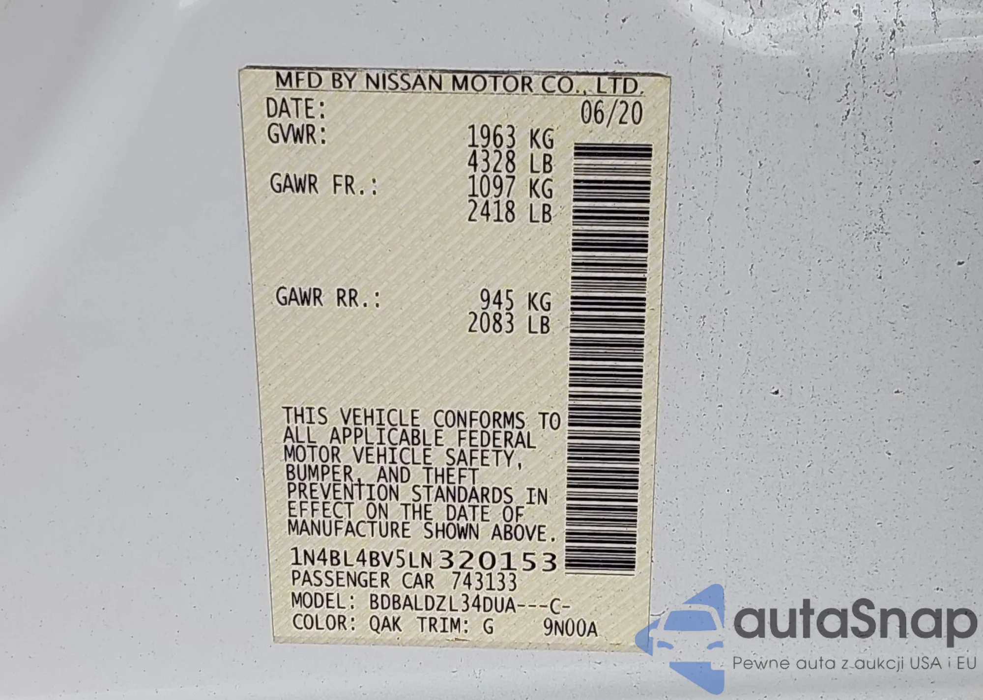 • VIN 1N4BL4BV5LN320153
