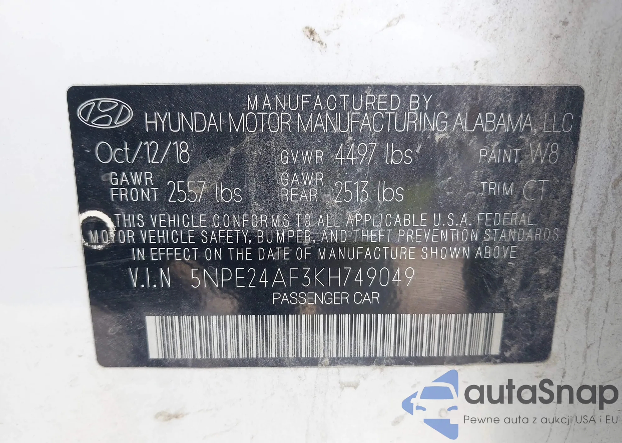 • VIN 5NPE24AF3KH749049