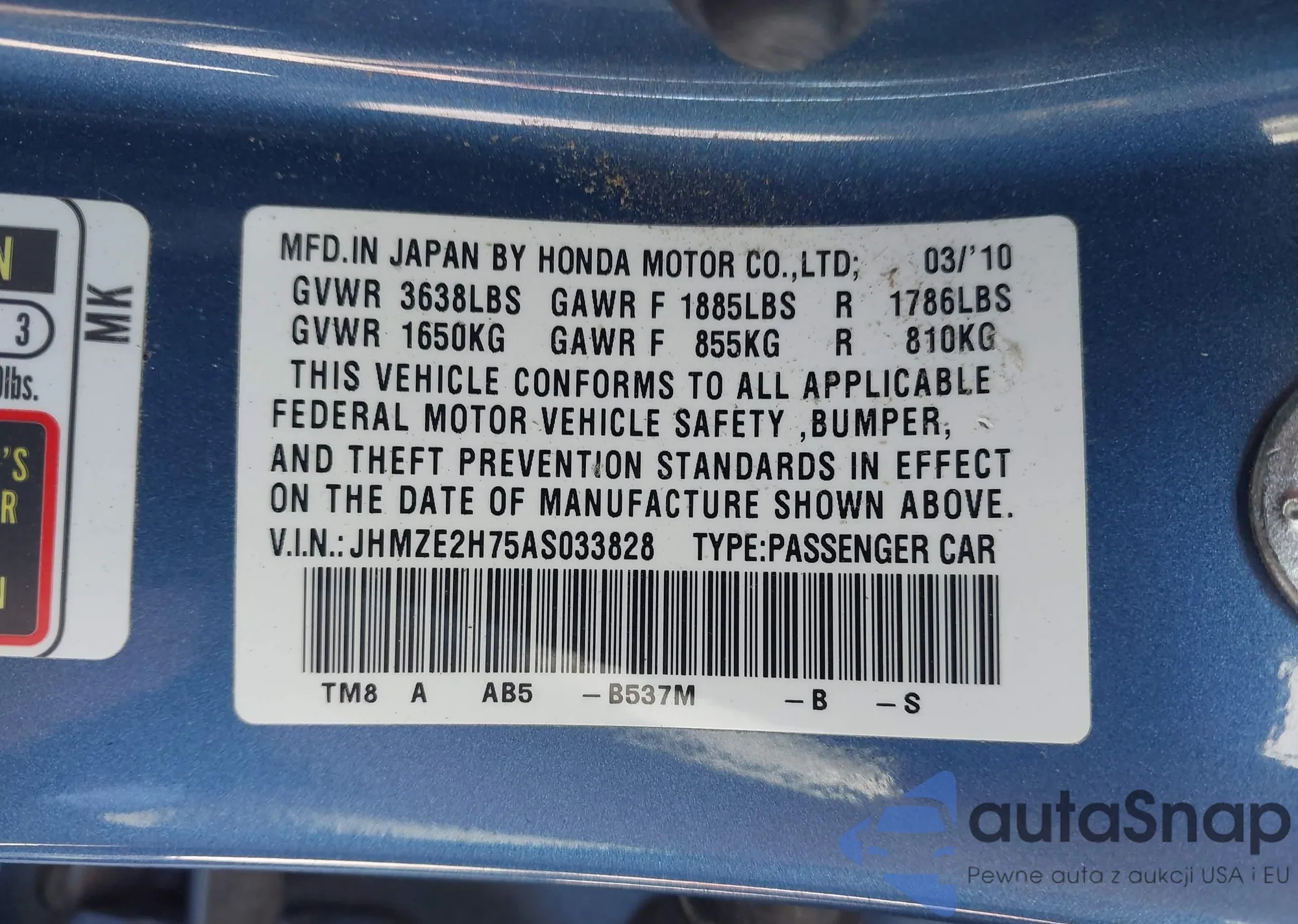 • VIN 19UDE4H38SA010797