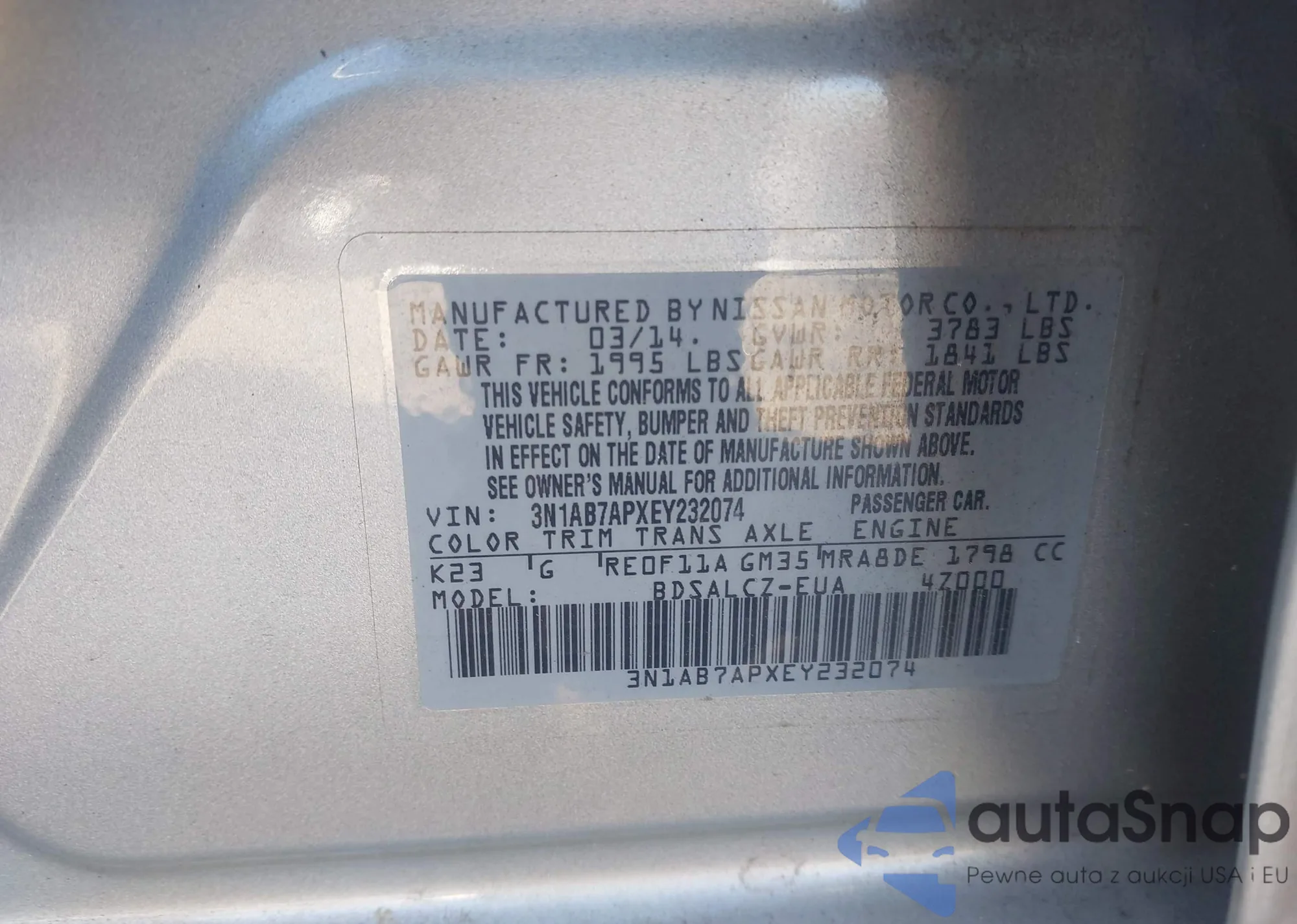 • VIN 3N1AB7APXEY232074