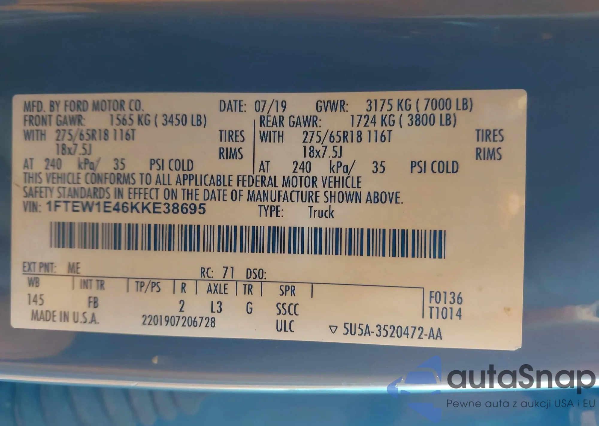 LOT: 44117956 VIN: 1FTEW1E46KKE38695