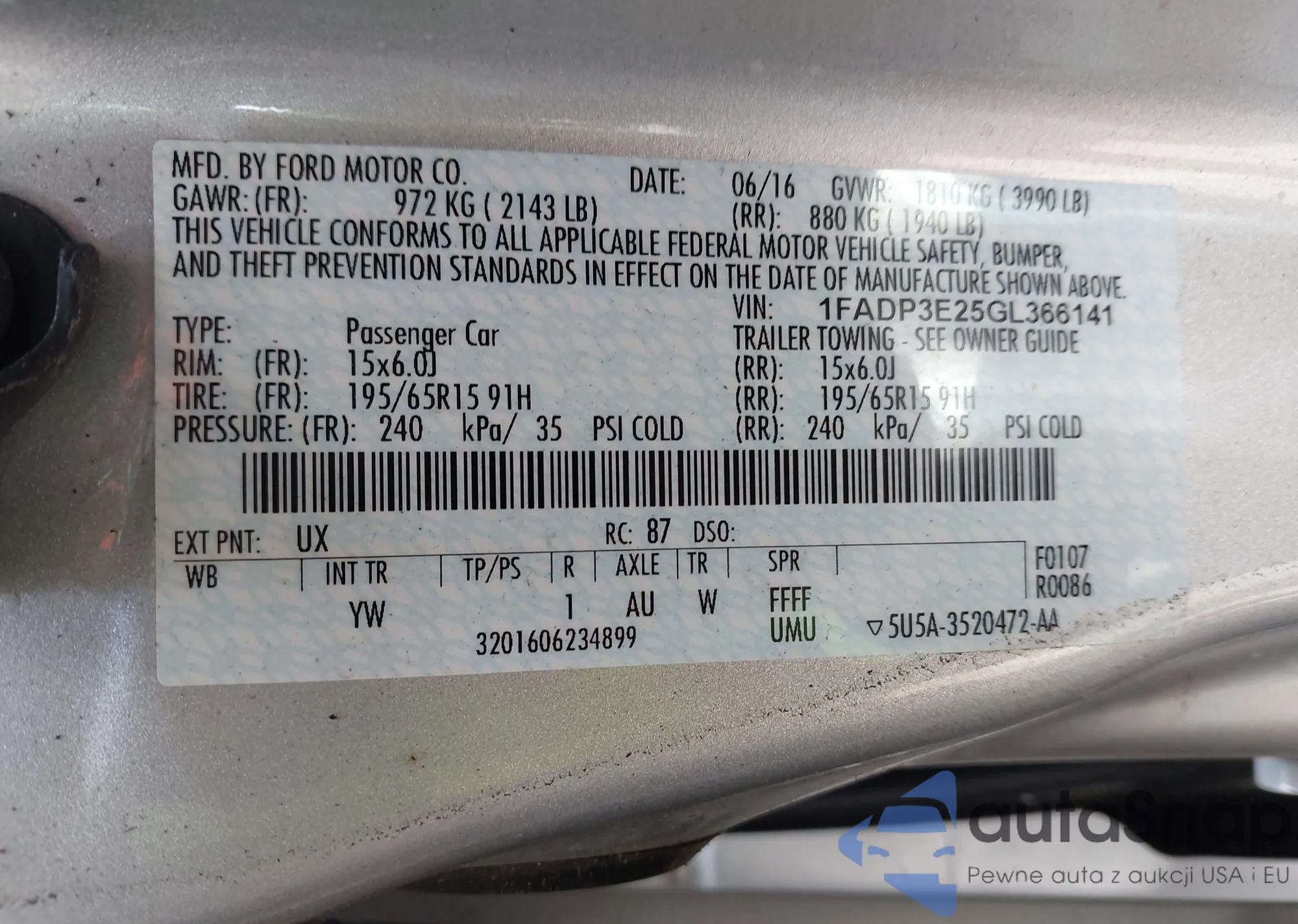 • VIN 1FADP3E25GL366141