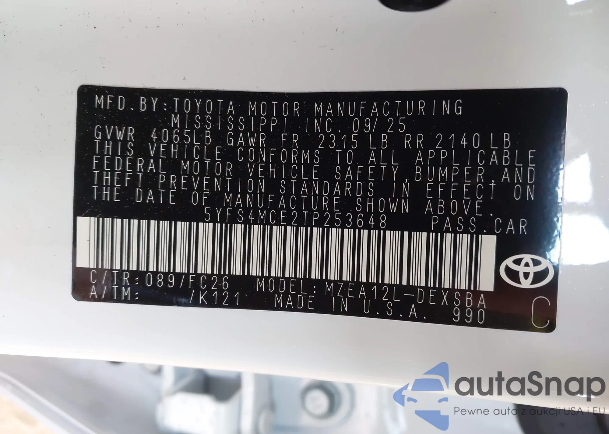 • VIN 5YFS4MCE2TP253648