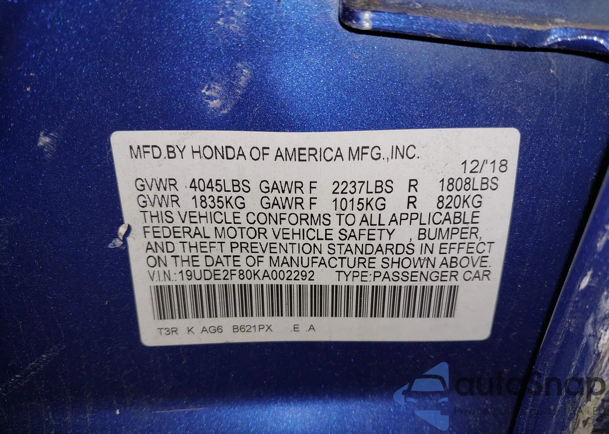 • VIN 19UDE2F89KA000377