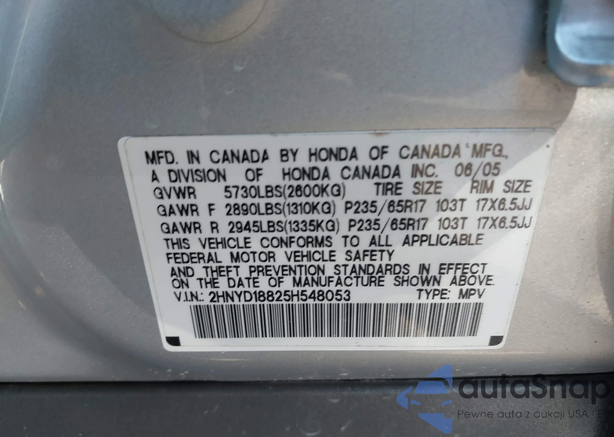 LOT: 43819446 VIN: 2HNYD18825H548053