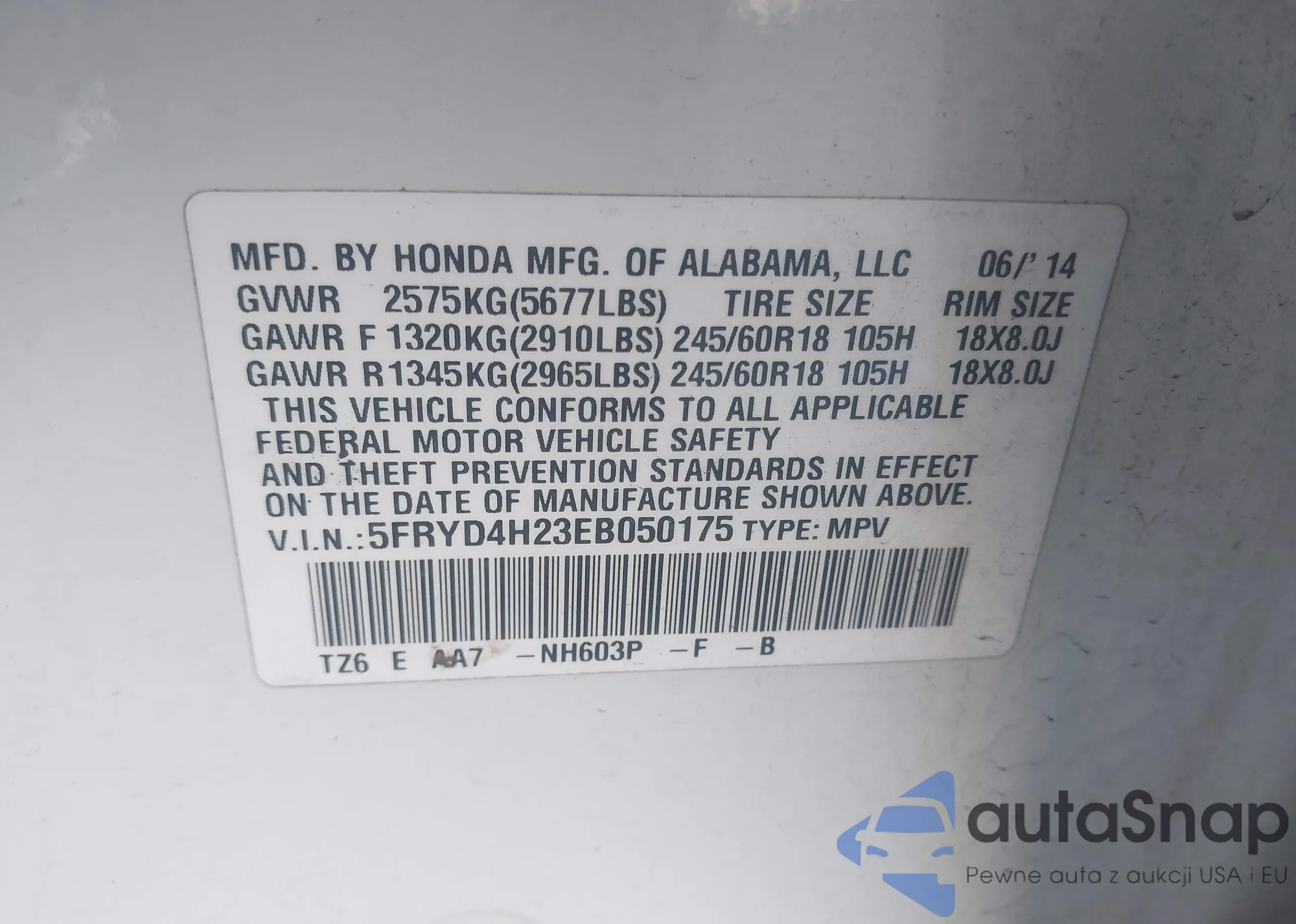 LOT: 44148603 VIN: 5FRYD4H23EB050175