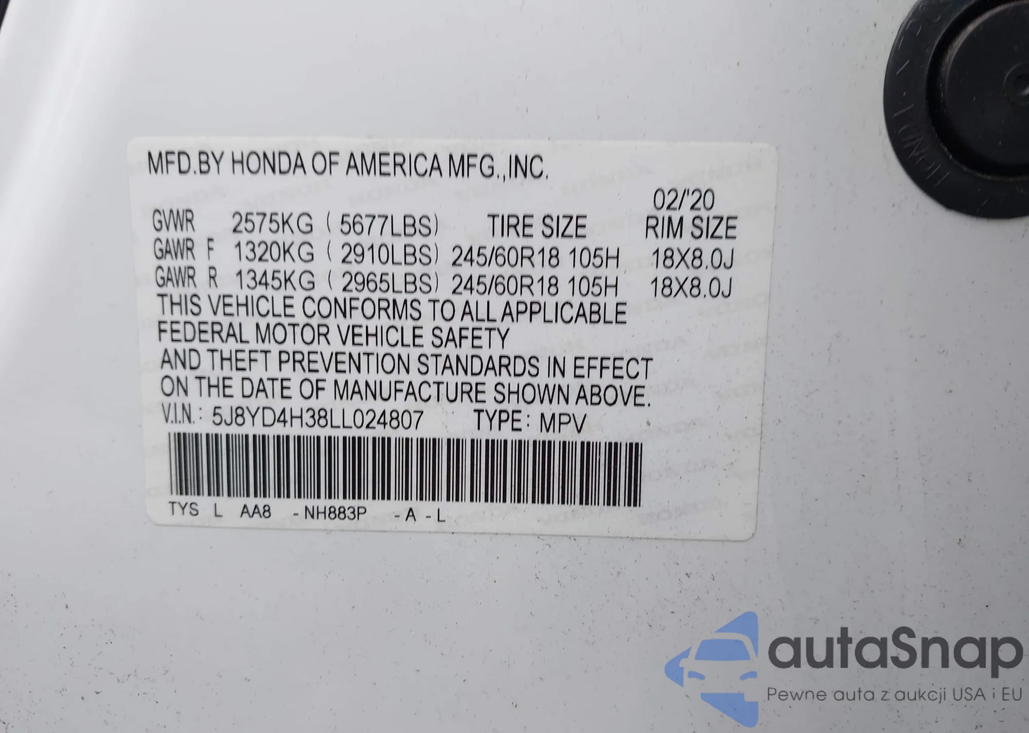 LOT: 43450308 VIN: 5J8YD4H38LL024807