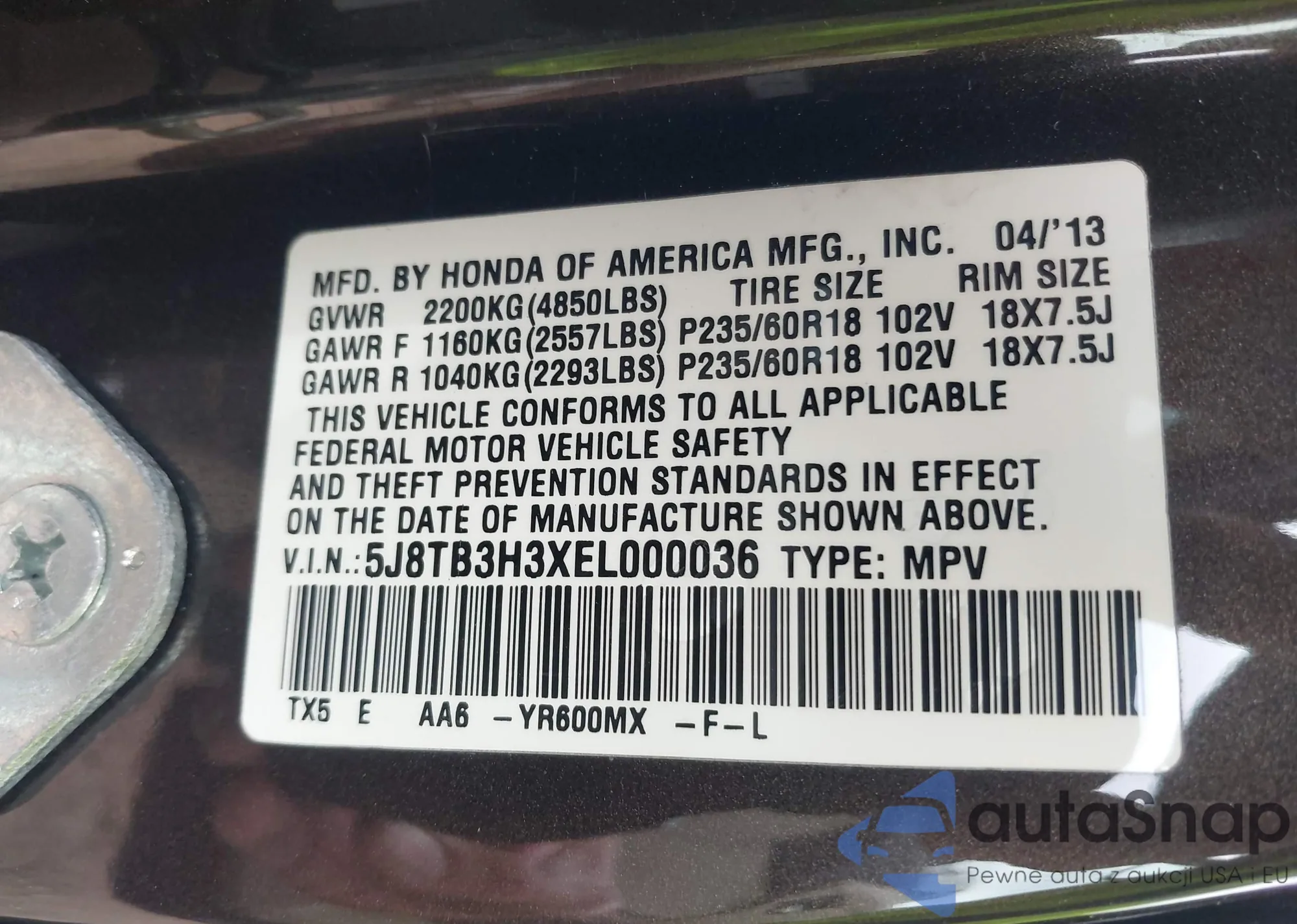 • VIN 5J8TB3H38DL019134