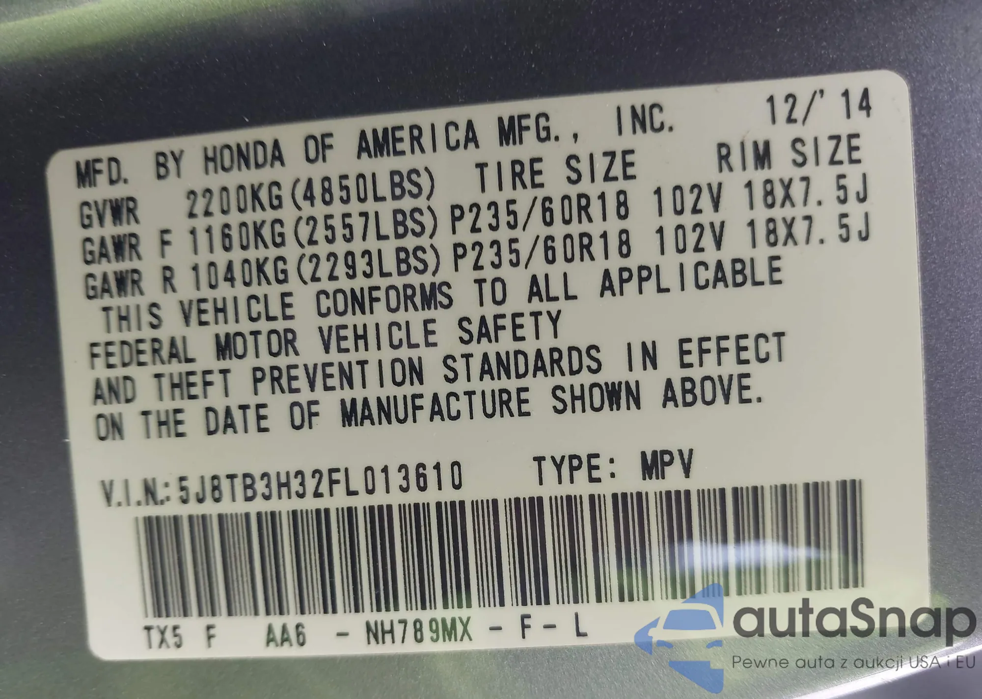 • VIN 5J8TB3H50FL012201