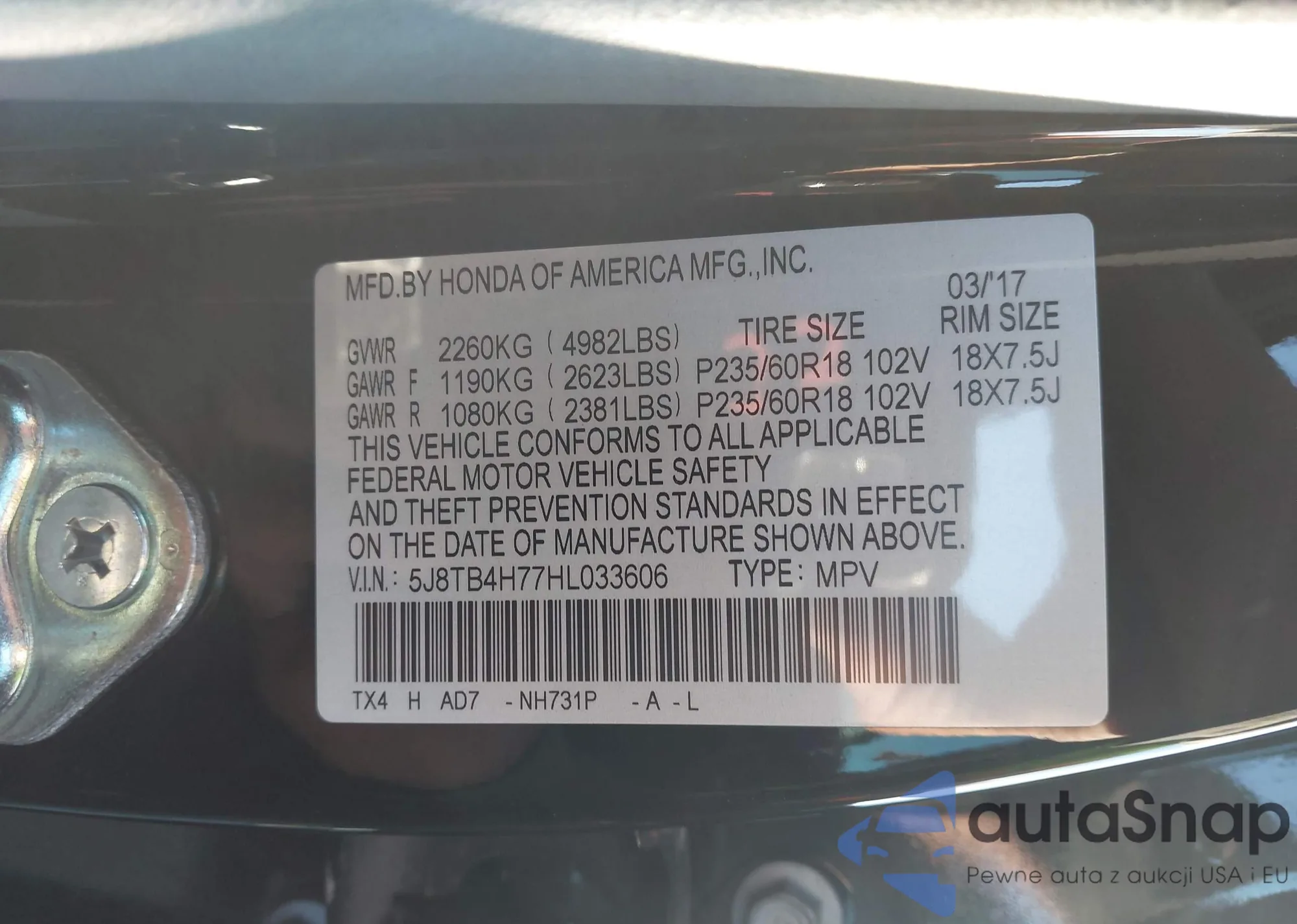 • VIN 5J8TB4H77HL033606
